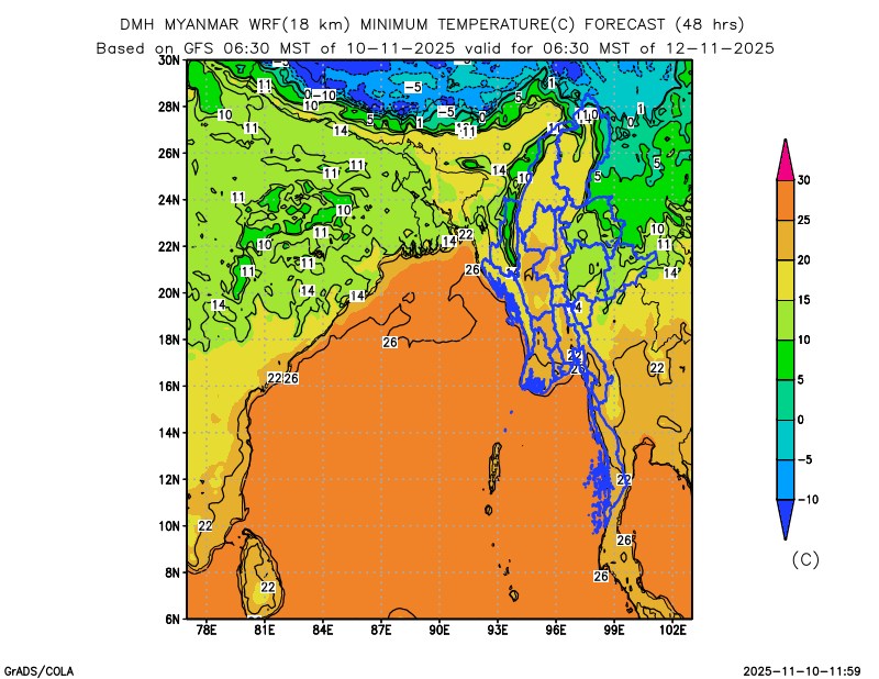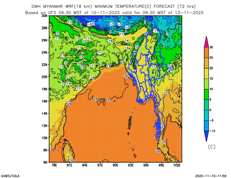 နောက် ၂ ရက်အတွက်ခန့်မှန်းချက်။ မန္တလေးတိုင်းဒေသကြီး၊ မကွေးတိုင်းဒေသကြီး၊ စစ်ကိုင်းတိုင်းဒေသကြီး၊ ကချင်ပြည်နယ်၊ ချင်းပြည်နယ်နှင့် ရှမ်းပြည်နယ်တို့တွင် ညအပူချိန်များ အနည်းငယ် လျော့နည်းနိုင်ပါသည်။