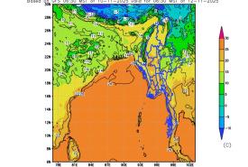 ယမန်နေ့နံနက် ၀၉:၃၀ နာရီအချိန်မှ ယနေ့နံနက် ၀၉:၃၀ နာရီအချိန်အထိ မိုးလေဝသတိုင်းထွာချက် အကျဉ်းချုပ်။ လွန်ခဲ့သော ၂၄ နာရီအတွင်းက ရန်ကုန်တိုင်းဒေသကြီး၊ တနင်္သာရီတိုင်းဒေသကြီး၊ မွန်ပြည်နယ်နှင့် ရှမ်းပြည်နယ်(တောင်ပိုင်းနှင့် အရှေ့ပိုင်း)တို့တွင် နေရာအနှံအပြား၊ နေပြည်တော်၊ ပဲခူးတိုင်းဒေသကြီး၊ ဧရာဝတီတိုင်းဒေသကြီး၊ ကယားပြည်နယ်နှင့် ကရင်ပြည်နယ်တို့တွင် နေရာစိပ်စိပ်နှင့် ရှမ်းပြည်နယ်(မြောက်ပိုင်း)တွင် နေရာကွက်ကျား မိုးထစ်ချုန်းရွာခဲ့ပြီး ကျန်တိုင်းဒေသကြီးနှင့် ပြည်နယ်တို့တွင် တိမ်အသင့်အတင့် ဖြစ်ထွန်းခဲ့ပါသည်။ ညအပူချိန်များမှာ ချင်းပြည်နယ်တွင် နိုဝင်ဘာလ၏ ပျမ်းမျှအပူချိန်အောက် ၂ ဒီဂရီဆဲလ်စီးယပ် လျော့နည်းခဲ့ပြီး မန္တလေးတိုင်းဒေသကြီး၊ မကွေးတိုင်းဒေသကြီး၊ စစ်ကိုင်းတိုင်းဒေသကြီးအောက်ပိုင်း၊ ဧရာဝတီတိုင်းဒေသကြီးနှင့် ကချင်ပြည်နယ်တို့တွင် နိုဝင်ဘာလ၏ ပျမ်းမျှအပူချိန်တို့ထက် ၂ ဒီဂရီဆဲလ်စီးယပ်၊ နေပြည်တော်နှင့် ကယားပြည်နယ်တို့တွင် နိုဝင်ဘာလ၏ ပျမ်းမျှအပူချိန်တို့ထက် ၃ ဒီဂရီဆဲလ်စီးယပ်နှင့် ရှမ်းပြည်နယ် (တောင်ပိုင်းနှင့် အရှေ့ပိုင်း)တွင် နိုဝင်ဘာလ၏ ပျမ်းမျှအပူချိန်ထက် ၅ ဒီဂရီဆဲလ်စီးယပ်မှ ၆ ဒီဂရီဆဲလ်စီးယပ်အထိပိုခဲ့ကာ ကျန်တိုင်းဒေသကြီးနှင့် ပြည်နယ်တို့တွင် နိုဝင်ဘာလ၏ ပျမ်းမျှအပူချိန်ခန့်သာ ရှိခဲ့ပါသည်။ ထူးခြားသည့် ညအပူချိန်များမှာ ဟားခါးမြို့တွင် ၇.၅ ဒီဂရီဆဲလ်စီးယပ်၊ ဟုမ္မလင်းမြို့တွင် ၁၂.၅ ဒီဂရီဆဲလ်စီးယပ်၊ လွိုင်လင်မြို့တွင် ၁၄.၁ ဒီဂရီဆဲလ်စီးယပ်၊ ပြင်ဦးလွင်မြို့တွင် ၁၄.၆ ဒီဂရီဆဲလ်စီးယပ်၊ နောင်ချိုမြို့တွင် ၁၄.၈ ဒီဂရီဆဲလ်စီးယပ်၊ ပူတာအိုမြို့တွင် ၁၆.၀ ဒီဂရီဆဲလ်စီးယပ်နှင့် တောင်ကြီးမြို့တွင် ၁၇.၀ ဒီဂရီဆဲလ်စီးယပ်တို့ ဖြစ်ကြပါသည်။ မှတ်သားဖွယ်ရာ မိုးရေချိန်များမှာ လှည်းကူးမြို့တွင် ၂.၈၃ လက်မ၊ မအူပင်မြို့တွင် ၂.၂၄ လက်မ၊ ပင်လောင်းမြို့တွင် ၂.၀၉ လက်မ၊ မော်လမြိုင်မြို့နှင့် လေးမျက်နှာမြို့တို့တွင် ၁.၈၀ လက်မစီ၊ ပဲခူးမြို့တွင် ၁.၇၆ လက်မ၊ မိုင်းပျဉ်းမြို့တွင် ၁.၄၀ လက်မ၊ ချောင်းဆုံမြို့တွင် ၁.၃၀ လက်မနှင့် မှော်ဘီမြို့နှင့် သာယာဝတီမြို့တို့တွင် ၁.၁၈ လက်မစီတို့ ဖြစ်ကြပါသည်။
