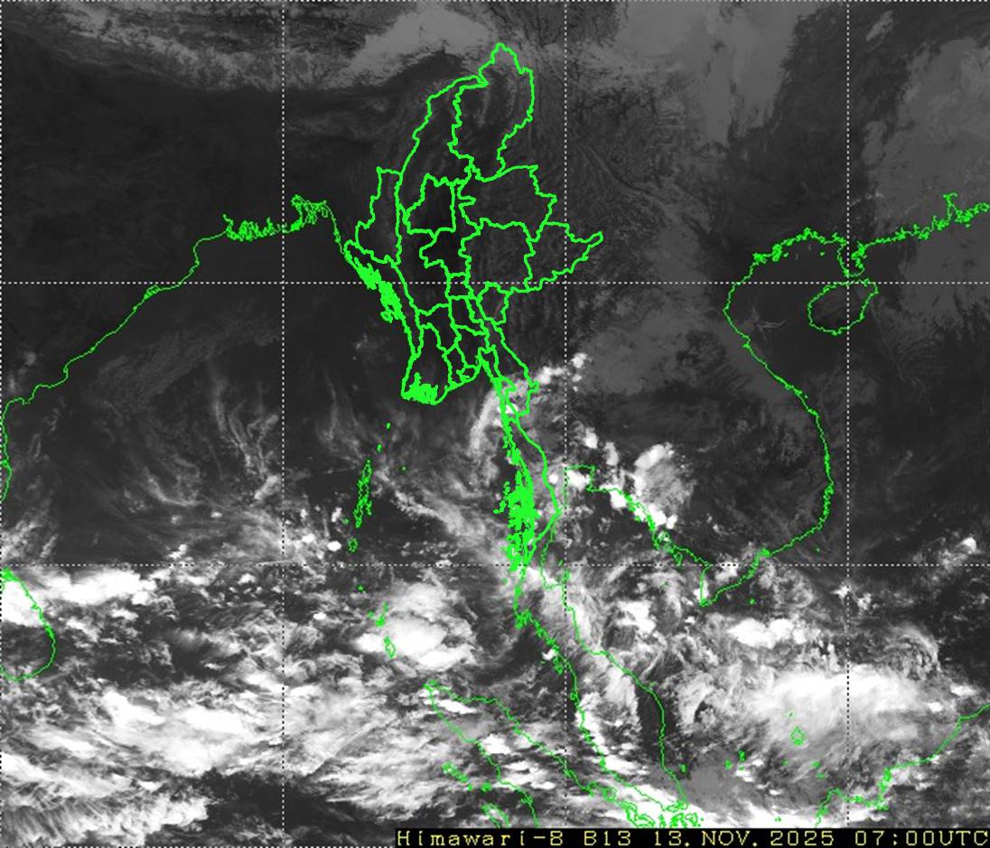 ယမန်နေ့နံနက် ၀၉:၃၀ နာရီအချိန်မှ ယနေ့နံနက် ၀၉:၃၀ နာရီအချိန်အထိ မိုးလေဝသတိုင်းထွာချက် အကျဉ်းချုပ်။ လွန်ခဲ့သော ၂၄ နာရီအတွင်းက တနင်္သာရီတိုင်းဒေသကြီးတွင် နေရာကျဲကျဲနှင့် ကရင်ပြည်နယ်နှင့် မွန်ပြည်နယ်တို့တွင် နေရာကွက်ကျား မိုးထစ်ချုန်းရွာခဲ့ပြီး၊ နေပြည်တော်၊ စစ်ကိုင်း တိုင်းဒေသကြီးအောက်ပိုင်း၊ ချင်းပြည်နယ်၊ ရခိုင်ပြည်နယ်နှင့် ရှမ်းပြည်နယ်(မြောက်ပိုင်း)တို့တွင် အများအားဖြင့် သာယာခဲ့ကာ ကျန်တိုင်းဒေသကြီးနှင့် ပြည်နယ်တို့တွင် တိမ်အသင့်အတင့် ဖြစ်ထွန်းခဲ့ပါသည်။ ညအပူချိန်များမှာ ချင်းပြည်နယ်တွင် နိုဝင်ဘာလ၏ ပျမ်းမျှအပူချိန်အောက် ၂ ဒီဂရီဆဲလ်စီးယပ် လျော့နည်းခဲ့ပြီး၊ ကချင်ပြည်နယ်နှင့် ရခိုင်ပြည်နယ်တို့တွင် နိုဝင်ဘာလ၏ ပျမ်းမျှအပူချိန်တို့ထက် ၂ ဒီဂရီဆဲလ်စီးယပ်ပိုခဲ့ကာ ကျန်တိုင်းဒေသကြီးနှင့် ပြည်နယ်တို့တွင် နိုဝင်ဘာလ၏ ပျမ်းမျှအပူချိန်ခန့်သာ ရှိခဲ့ပါသည်။ ထူးခြားသည့် ညအပူချိန်များမှာ ဟားခါးမြို့တွင် ၄.၆ ဒီဂရီဆဲလ်စီးယပ်၊ လွိုင်လင်မြို့တွင် ၇.၆ ဒီဂရီဆဲလ်စီးယပ်၊ တီးတိန်မြို့တွင် ၈.၅ ဒီဂရီဆဲလ်စီးယပ်၊ နမ့်စန်မြို့(ရှမ်းပြည်နယ်တောင်ပိုင်း)တွင် ၈.၆ ဒီဂရီဆဲလ်စီးယပ်၊ ဟဲဟိုးမြို့တွင် ၁၀.၀ ဒီဂရီဆဲလ်စီးယပ်၊ ပင်လောင်းမြို့တွင် ၁၀.၂ ဒီဂရီဆဲလ်စီးယပ်၊ တောင်ကြီးမြို့တွင် ၁၁.၄ ဒီဂရီဆဲလ်စီးယပ်၊ ပြင်ဦးလွင်မြို့တွင် ၁၁.၇ ဒီဂရီဆဲလ်စီးယပ်နှင့် လားရှိုးမြို့တွင် ၁၁.၈ ဒီဂရီဆဲလ်စီးယပ်တို့ ဖြစ်ကြပါသည်။ မှတ်သားဖွယ်ရာ မိုးရေချိန်များမှာ ဘီးလင်းမြို့တွင် ၀.၂၄ လက်မနှင့် မြိတ်မြို့တွင် ၀.၀၄ လက်မတို့ ဖြစ်ကြပါသည်။