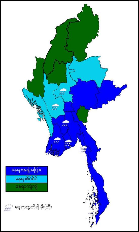 လွန်ခဲ့သော(၂၄)နာရီအတွင်းက ချင်းပြည်နယ်တွင် တိမ်အသင့်အတင့် ဖြစ်ထွန်းခဲ့ပြီး၊ စစ်ကိုင်းတိုင်း ဒေသကြီးအောက်ပိုင်းနှင့် ရခိုင်ပြည်နယ်တို့တွင် နေရာကွက်ကျား၊ စစ်ကိုင်းတိုင်းဒေသကြီးအထက်ပိုင်း၊ မန္တလေးတိုင်းဒေသကြီး၊ မကွေးတိုင်း ဒေသကြီးနှင့်  ကချင်ပြည်နယ်တို့တွင် နေရာကျဲကျဲ၊ ဧရာဝတီတိုင်း ဒေသကြီး၊ တနင်္သာရီတိုင်းဒေသကြီး၊ ရှမ်းပြည်နယ်(အရှေ့ပိုင်း)နှင့် ကယားပြည်နယ်တို့တွင် နေရာစိပ်စိပ်နှင့် ကျန်တိုင်းဒေသကြီးနှင့် ပြည်နယ်တို့တွင် နေရာအနှံ့အပြား မိုးထစ်ချုန်းရွာခဲ့ပြီး၊ မွန်ပြည်နယ်တွင် ဒေသအလိုက်နှင့် ရန်ကုန်တိုင်းဒေသကြီး တွင် နေရာကွက်၍ မိုးကြီးခဲ့ပါသည်။ မှတ်သားဖွယ်ရာ မိုးရေချိန်များမှာ ချောင်းဆုံမြို့တွင် (၃.၇၄)လက်မ၊ ကျိုက်မရောမြို့တွင် (၃.၅၄)လက်မ၊ သထုံမြို့တွင် (၃.၅၁)လက်မ၊ ခရမ်းမြို့တွင် (၃.၁၉)လက်မ၊ ပေါင်မြို့တွင် (၂.၈၃)လက်မ၊ ရန်ကုန် (ဒဂုံမြို့သစ်မြောက်ပိုင်းမြို့နယ်)တွင် (၂.၅၆)လက်မ၊ လှည်းကူးမြို့တွင် (၂.၅၂)လက်မ၊ မော်လမြိုင်မြို့ တွင် (၂.၄၈)လက်မ၊ မုဒုံမြို့တွင် (၂.၂၈)လက်မနှင့် ဥက္ကံမြို့တွင် (၂.၂၄)လက်မတို့ ဖြစ်ကြပါသည်။