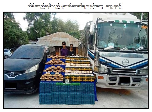မူးယစ်ဆေးဝါး တားဆီးနှိမ်နင်းရေးရဲတပ်ဖွဲ့ဝင်များ ပါဝင်သော ပူးပေါင်းအဖွဲ့သည် မေ ၃၀ ရက် မွန်းလွဲ ၁ နာရီခွဲတွင် မန္တလေးတိုင်းဒေသကြီး၊ ပြည်ကြီးတံခွန်မြို့နယ်၊ (ဈ)ရပ်ကွက်၊ ၁၃၉ လမ်း၊ ၅၂ x ၅၃ လမ်းကြားရှိ ဂိုထောင်ကို သတင်းအရရှာဖွေရာ ဟိန်းဝင်းစိုးနှင့် တာရိုစေး တို့ ၂ ဦးကို HINO ၁၂ ဘီး မော်တော်ယာဉ်တစ်စီး၊ NISSAN VAN မော်တော်ယာဉ်တစ်စီးနှင့်အတူ တွေ့ရှိပြီး HINO ၁၂ ဘီးယာဉ်ပေါ်မှ ဒေသကာလတန်ဖိုးငွေကျပ် သိန်း ၇,၅၀၀ ကျော်တန်ဖိုးရှိ ဘိန်းဖြူ ၉ ဒသမ ၉ ကီလို နှင့် စိတ်ကြွရူးသွပ်ဆေးပြား ၃ ဒသမ ၃၆ သိန်း သိမ်းဆည်းရမိခဲ့ကြောင်း၊ စစ်ဆေးဖော်ထုတ် ချက်အရ သိမ်းဆည်းရမိ မူးယစ်ဆေးဝါးများကို ရှမ်းပြည်နယ်မှ မန္တလေးတိုင်းဒေသကြီးသို့ သယ်ဆောင်ခြင်းဖြစ်ကြောင်း သိရှိရသဖြင့် ၎င်းတို့အား ဥပဒေအရအရေးယူထားရှိပြီး ကွင်းဆက်ပြစ်မှု ကျူးလွန်သူများကို ဆက်လက်စစ်ဆေး ဖော်ထုတ်လျက်ရှိကြောင်း သိရသည်။