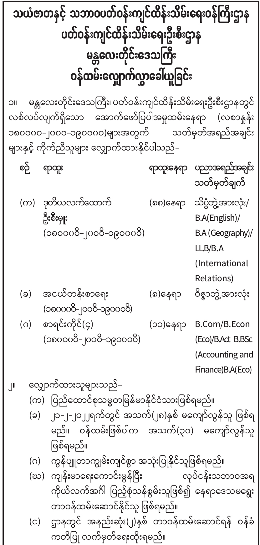 မန္တလေးတိုင်းဒေသကြီး၊ ပတ်ဝန်းကျင်ထိန်းသိမ်းရေးဦးစီးဌာနတွင် လစ်လပ်လျက်ရှိသော အောက်ဖော်ပြပါ ရာထူးနေရာများအတွက် သတ်မှတ်အရည်အချင်းများနှင့် ကိုက်ညီသူများ လျှောက်ထားနိုင်