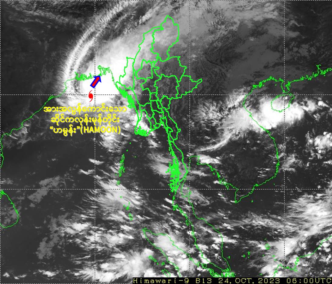 ယနေ့မြန်မာစံတော်ချိန် (၁၂:၃၀)နာရီအချိန် တိုင်းထွာချက်များအရ ဘင်္ဂလားပင်လယ်အော် အနောက်မြောက်ပိုင်းတွင် ဖြစ်ပေါ်နေသော အားကောင်းသော ဆိုင်ကလုန်းမုန်တိုင်း(Severe Cyclonic Storm)“ဟမွန်း”(HAMOON)သည် အရှေ့မြောက်ဘက်သို့ ရွေ့လျားခဲ့ပြီး၊ ပိုမိုအားကောင်းလာကာ ဘင်္ဂလားပင်လယ်အော်အနောက်မြောက်ပိုင်းနှင့် ယင်းနှင့်ဆက်စပ်လျက်ရှိသော ဘင်္ဂလား ပင်လယ်အော်အရှေ့မြောက်ပိုင်းတို့တွင် အားအလွန်ကောင်းသော ဆိုင်ကလုန်းမုန်တိုင်း(Very Severe Cyclonic Storm) “ဟမွန်း”(HAMOON)အဖြစ်သို့ ရောက်ရှိခဲ့ပါသည်။ အဆိုပါ အားအလွန်ကောင်းသော ဆိုင်ကလုန်းမုန်တိုင်း “ဟမွန်း”(HAMOON)သည် မြန်မာနိုင်ငံ၊ သံတွဲမြို့(Thandwe)၏ အနောက်-အနောက်မြောက်ဘက် ရေမိုင် (၂၉၀)မိုင်ခန့်၊ စစ်တွေမြို့(Sittwe)၏ အနောက်ဘက် ရေမိုင် (၁၉၀) မိုင်ခန့်၊ မောင်တောမြို့ (Maungdaw) ၏ အနောက် - အနောက်တောင်ဘက် ရေမိုင် (၁၇၀)မိုင်ခန့်၊ အိန္ဒိယနိုင်ငံ၊ ပါရာဒစ်မြို့ (Paradip)၏ အရှေ့ဘက် ရေမိုင် (၁၆၀)မိုင်ခန့်၊ ဒီဂါမြို့ (Digha) ၏ အရှေ့တောင်ဘက် ရေမိုင်(၁၅၀)မိုင်ခန့်၊ ဘင်္ဂလားဒေရှ့်နိုင်ငံ၊ ခီပူပါရာမြို့ (Khepupara) ၏ တောင်-အနောက်တောင်ဘက် ရေမိုင် (၁၂၅) မိုင်ခန့်နှင့် စစ်တကောင်းမြို့ (Chittagong)၏ အနောက်တောင် ဘက် ရေမိုင် (၁၉၀)မိုင်ခန့်အကွာ ပင်လယ်ပြင်ကို ဗဟိုပြုနေပါသည်။ ဘင်္ဂလားပင်လယ်အော် မြောက်ပိုင်းတွင် တိမ်ထူထပ်နေပြီး၊ ကပ္ပလီပင်လယ်ပြင်နှင့် ကျန်ဘင်္ဂလားပင်လယ်အော်တို့တွင် တိမ်အသင့်အတင့်မှ တိမ်ထူထပ်နေပါသည်။