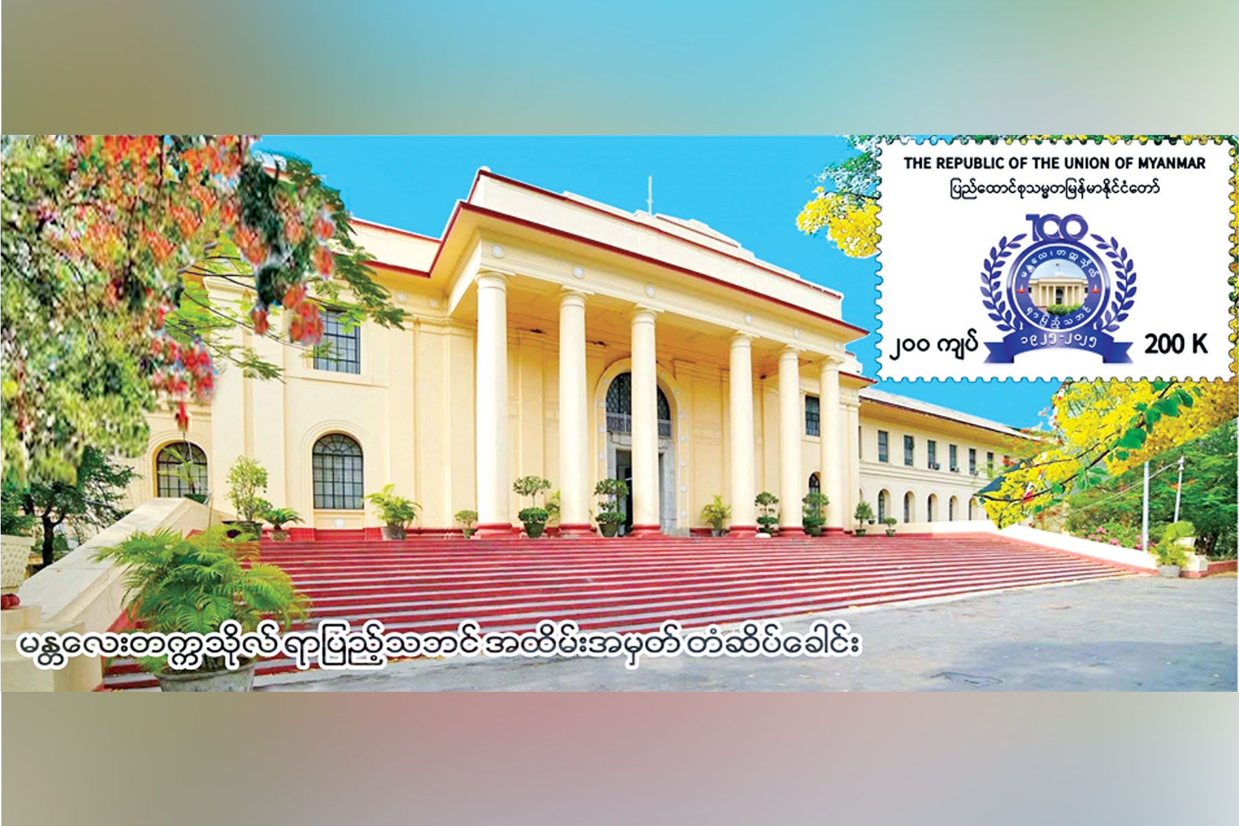 ပို့ဆောင်ရေးနှင့်ဆက်သွယ်ရေးဝန်ကြီးဌာန မြန်မာ့စာတိုက်လုပ်ငန်းမှ မန္တလေးတက္ကသိုလ် နှစ်(၁၀၀)ပြည့် ရာပြည့်သဘင် အထိမ်းအမှတ် (၂၀၀ ကျပ်တန်) အထူးထုတ် စာပို့တံဆိပ်ခေါင်းသစ် တစ်မျိုးအား ၂၀၂၅ ခုနှစ် ဒီဇင်ဘာ ၂၁ ရက် မြန်မာသက္ကရာဇ် ၁၃၈၇ ခုနှစ် ပြာသိုလဆန်း ၃ ရက် (တနင်္ဂနွေနေ့) နံနက် ၉ နာရီခွဲမှစတင်၍ နေပြည်တော် ဗဟိုစာတိုက်ကြီး၊ ရန်ကုန်စာတိုက်ကြီး၊ မန္တလေးစာတိုက်ကြီးတို့နှင့် တိုင်းဒေသကြီး/ ပြည်နယ်များရှိ စာတိုက်ကြီးများတွင် တစ်ပြိုင်တည်း ရောင်းချပေးသွားမည်ဖြစ်သည်။