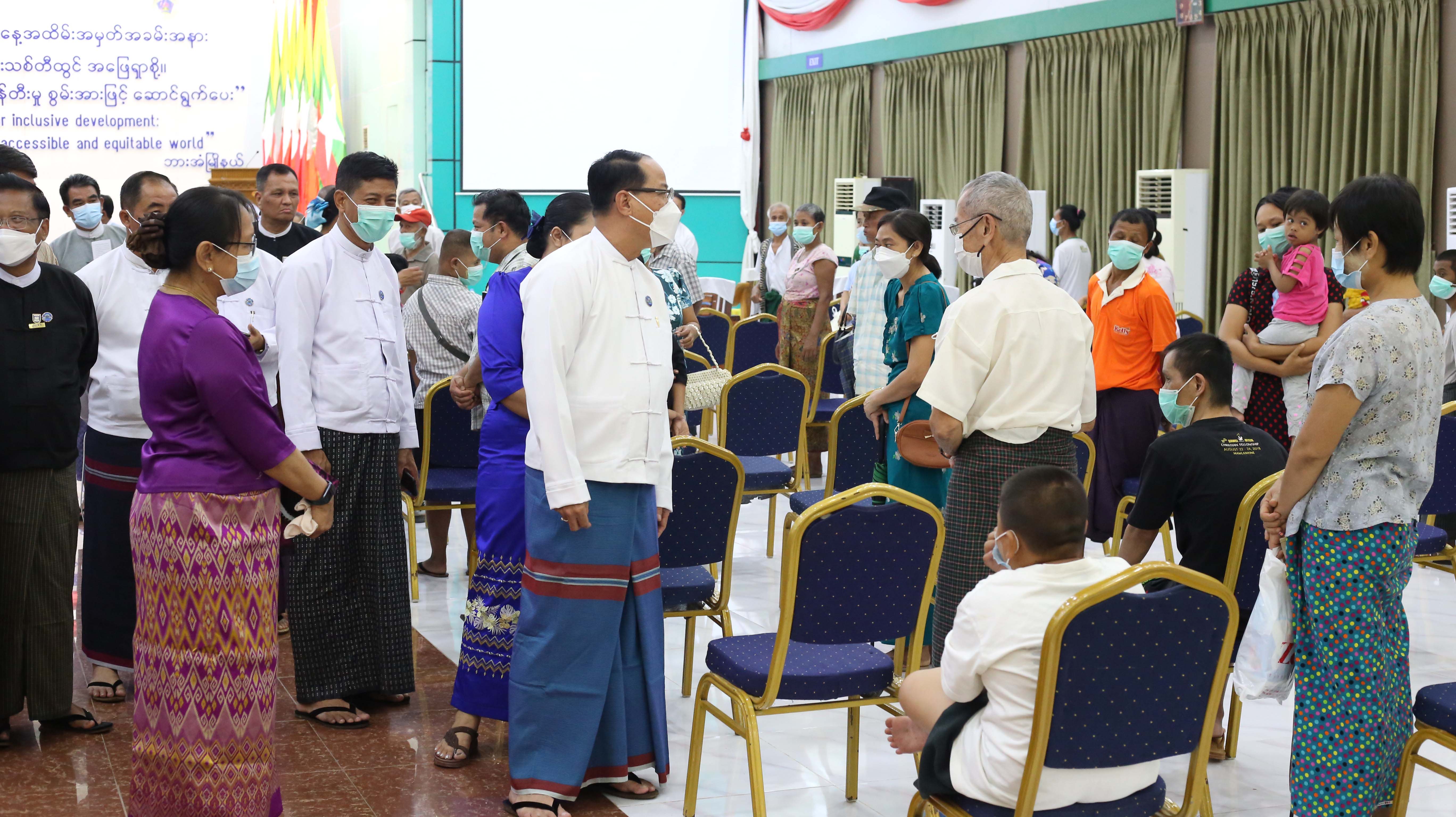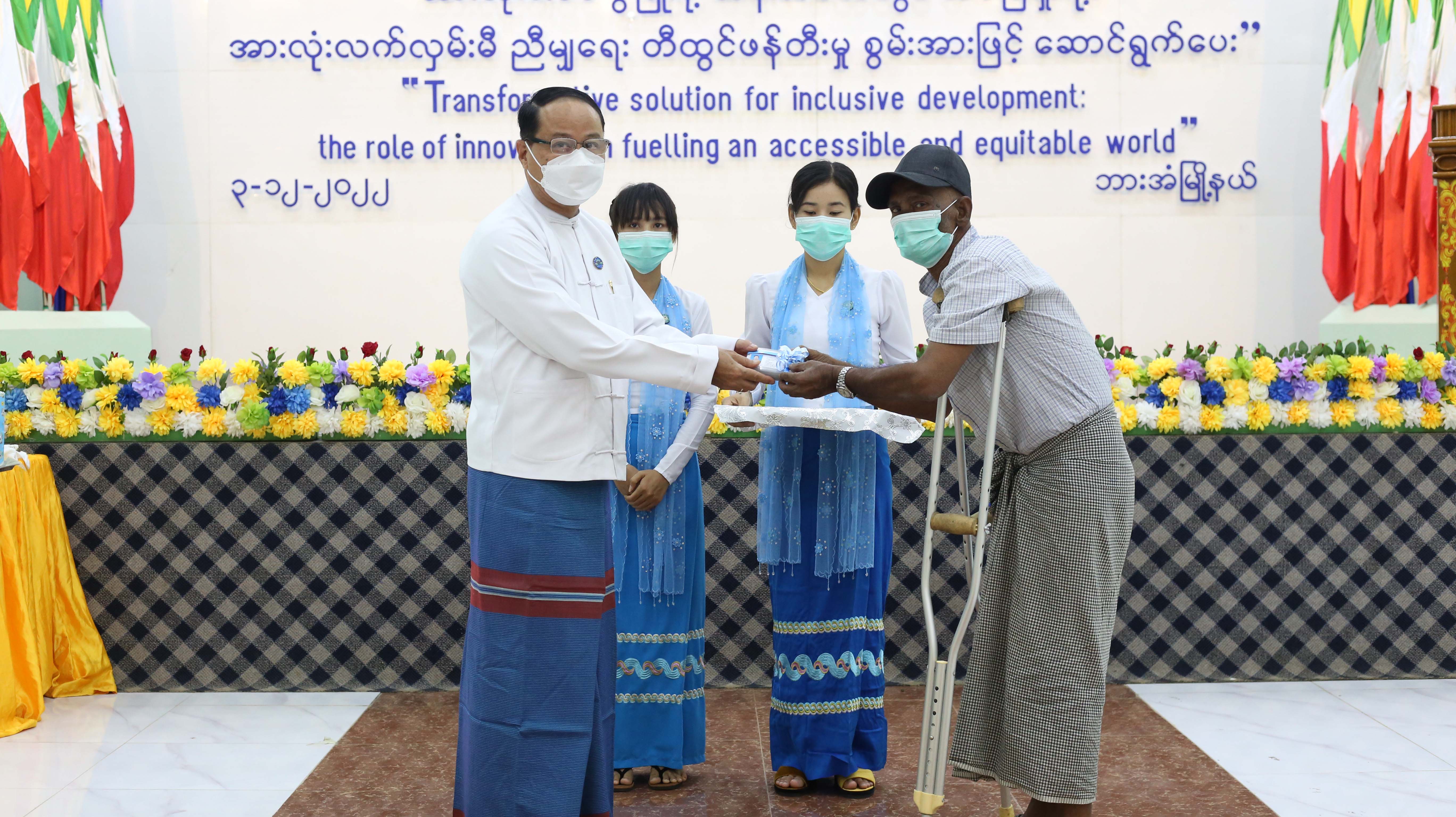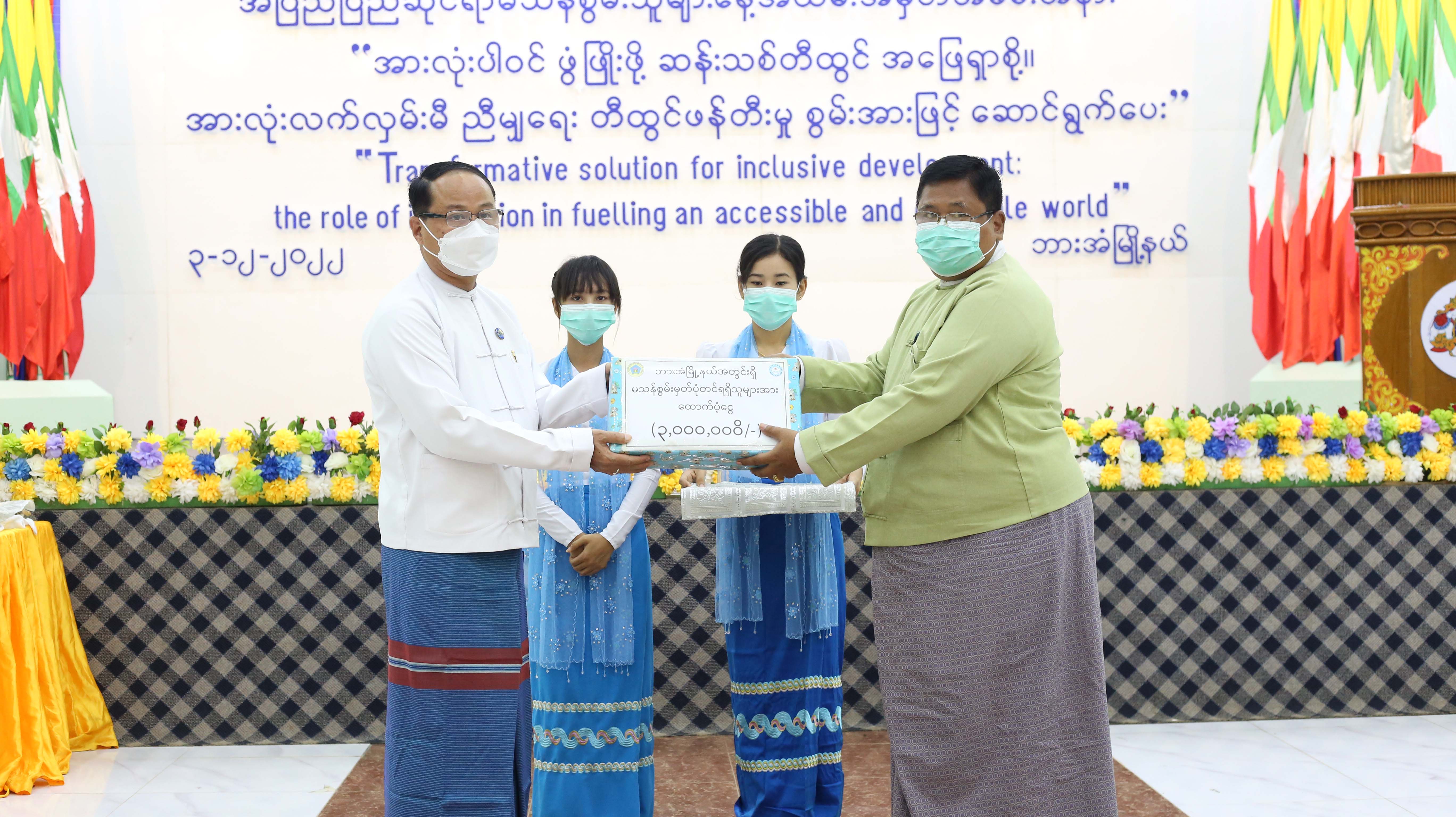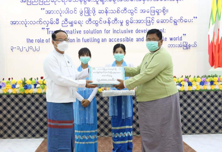 ယင်းနောက် ပြည်နယ်ဝန်ကြီးချုပ်၊ ပြည်နယ်တရားလွှတ်တော် တရားသူကြီးချုပ်နှင့် ပြည်နယ်အစိုးရအဖွဲ့ဝင်များက အပြည်ပြည်ဆိုင်ရာ မသန်စွမ်းသူများနေ့ အကြိုလှုပ်ရှားမှု မသန်စွမ်းသူများ အားကစားပြိုင်ပွဲတွင် ဆုရရှိကြသူများအား ဂုဏ်ပြုဆုများ ပေးအပ်ချီးမြှင့်ပြီး မသန်စွမ်းသူ ၁၀၀ အား မသန်စွမ်း မှတ်ပုံတင်များ ပေးအပ်ခဲ့ကြကာ ပြည်နယ်ဝန်ကြီးချုပ်က မသန်စွမ်းသူ ၁၀၀ အတွက် တစ်ဦးလျှင်ငွေကျပ် သုံးသောင်းနှုန်းဖြင့် စုစုပေါင်းငွေကျပ် သိန်း(၃၀)ကို ဘားအံမြို့နယ်အုပ်ချုပ်ရေးမှူးထံ ထောက်ပံ့ပေးအပ်သည်။