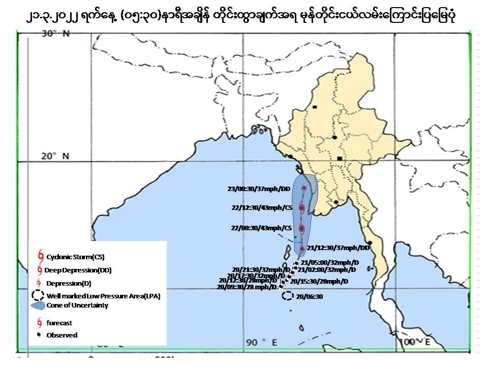 (၁) ယနေ့မြန်မာစံတော်ချိန်(၀၅:၃၀)နာရီအချိန် တိုင်းထွာချက်များအရ ကပ္ပလီပင်လယ်ပြင်မြောက်ပိုင်းနှင့်ယင်းနှင့်ဆက်စပ်လျက်ရှိသော ဘင်္ဂလားပင်လယ်အော်အရှေ့တောင်ပိုင်းတို့တွင် ဖြစ်ပေါ်နေသော မုန်တိုင်းငယ်(Depression)သည်မြောက်-အရှေ့မြောက်ဘက်သို့ ရွေ့လျားခဲ့ပြီး၊ မြန်မာနိုင်ငံ၊ ကိုကိုးကျွန်းမြို့၏ တောင်-အရှေ့တောင်ဘက် ရေမိုင်(၁၅၀)မိုင်ခန့်၊ ဟိုင်းကြီးကျွန်းမြို့၏တောင်-အနောက်တောင်ဘက်ရေမိုင်(၂၇၀)မိုင်ခန့်၊ ထားဝယ်မြို့၏ အနောက်တောင်ဘက် ရေမိုင်(၃၁၀)မိုင်ခန့်၊ မြိတ်မြို့၏ အနောက်-အနောက်တောင်ဘက် ရေမိုင်(၃၀၅)မိုင်ခန့်၊ မော်လမြိုင်မြို့၏ အနောက်တောင်ဘက် ရေမိုင်(၃၇၅)မိုင်ခန့်၊ ရန်ကုန်မြို့၏ တောင်-အနောက်တောင်ဘက် ရေမိုင်(၃၅၀)မိုင်ခန့်၊ အိန္ဒိယနိုင်ငံ၊ နီကိုးဘားကျွန်း(Nicobar Islands)၏ မြောက်-အရှေ့မြောက်ဘက်ရေမိုင်(၁၅၀)မိုင်ခန့်နှင့် ပို့ပလဲယား(Port Blair)၏ အရှေ့ဘက်ရေမိုင်(၄၅)မိုင်ခန့်အကွာ ပင်လယ်ပြင်ကို ဗဟိုပြုနေပါသည်။