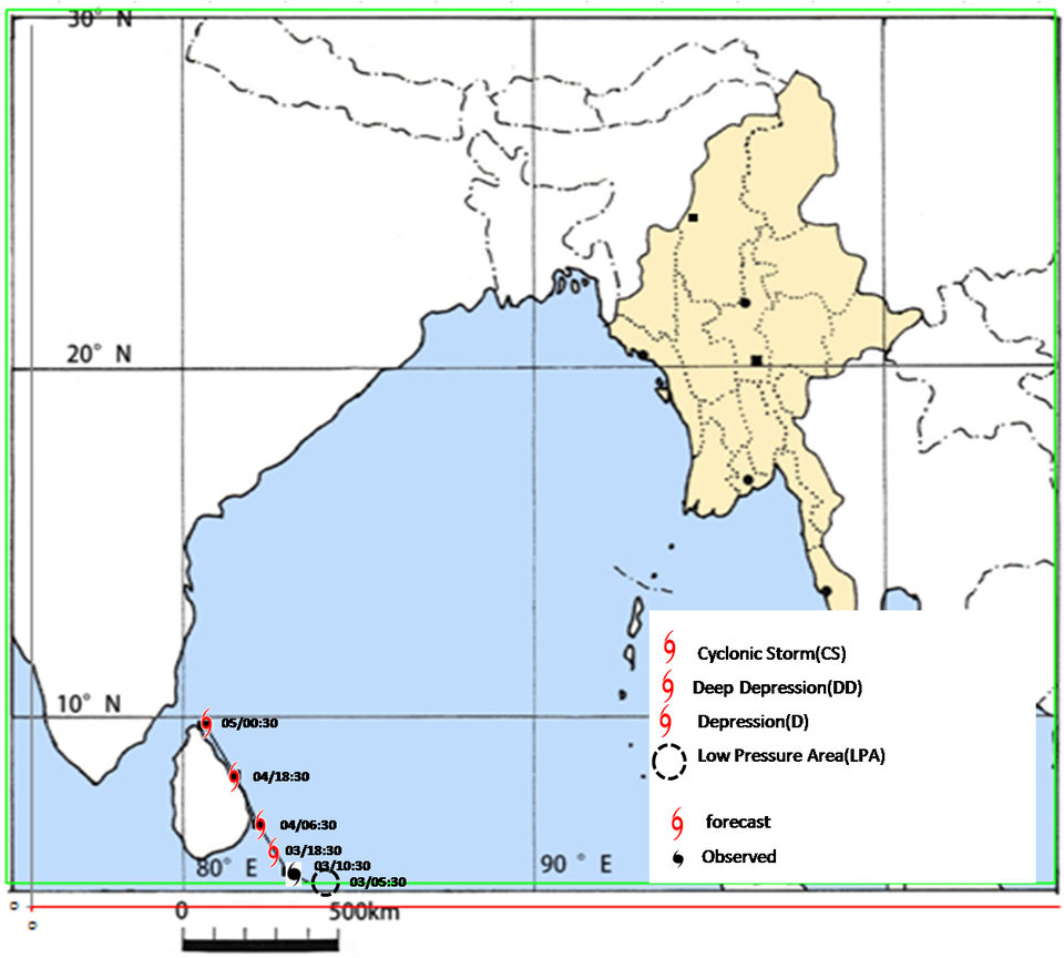 (၁)  ယနေ့မြန်မာစံတော်ချိန် (၁၀:၃၀)နာရီအချိန် တိုင်းထွာချက်များအရ ဘင်္ဂလားပင်လယ်အော် အနောက်တောင်ပိုင်းနှင့် ယင်းနှင့်ဆက်စပ်လျက်ရှိသော အီကွေတာအနီး အိန္ဒိယသမုဒ္ဒရာတို့တွင် ဖြစ်ပေါ်နေသော လေဖိအားနည်းရပ်ဝန်းသည် မြောက်-အနောက်မြောက်ဘက်သို့ ရွှေ့လျားခဲ့ပြီး မုန်တိုင်းငယ်(Depression) အဖြစ်သို့ ပိုမိုအားကောင်းလာကာ မြန်မာနိုင်ငံ ကိုကိုးကျွန်း(Coco Island) မြို့၏ အနောက်တောင်ဘက် ရေမိုင်(၇၇၅)မိုင်ခန့်၊ ဟိုင်းကြီးကျွန်း (Hainggyigyun) မြို့၏ အနောက်တောင်ဘက် ရေမိုင်(၈၉၀)မိုင်ခန့်၊ အိန္ဒိယနိုင်ငံ နာဂါပတ္တနမ် (Nagapattinam)မြို့၏ တောင်-အရှေ့တောင်ဘက် ရေမိုင် (၄၂၀)မိုင်ခန့်၊ ပူဒူချယ်ရီ(Puducherry)မြို့၏ တောင်-အရှေ့တောင်ဘက် ရေမိုင် (၄၈၀)မိုင် ခန့်နှင့် ချင်းနိုင်(Chennai)မြို့၏ တောင်- အရှေ့တောင်ဘက် ရေမိုင် (၅၂၀)မိုင် ခန့်အကွာ ပင်လယ်ပြင်ကို ဗဟိုပြုနေပါသည်။