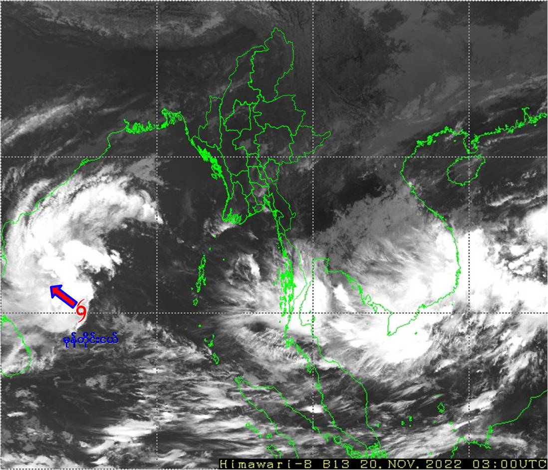 ယနေ့မြန်မာစံတော်ချိန် (၀၉:၃၀) နာရီတိုင်းထွာချက်များအရ ဘင်္ဂလားပင်လယ်အော် တောင်ပိုင်းတွင် ဖြစ်ပေါ်နေသော အားကောင်းသော လေဖိအားနည်းရပ်ဝန်း (Well Marked Low Pressure Area) သည် အနောက်-အနောက် မြောက်ဘက်သို့ ရွေ့လျားခဲ့ပြီး၊ ပိုမိုအားကောင်းလာကာ ဘင်္ဂလားပင်လယ်အော် အနောက်တောင်ပိုင်းနှင့် ယင်းနှင့်ဆက်စပ်လျက်ရှိသော ဘင်္ဂလားပင်လယ်အော် တောင်ပိုင်းတို့တွင် မုန်တိုင်းငယ် (Depression) အဖြစ်သို့ ရောက်ရှိခဲ့သည်။ အဆိုပါ မုန်တိုင်းငယ် (Depression) သည် မြန်မာနိုင်ငံ၊ ကိုကိုးကျွန်းမြို့ (Coco Island) ၏ အနောက်တောင်ဘက် ရေမိုင် (၅၁၅) မိုင်ခန့်၊ ဟိုင်းကြီးကျွန်းမြို့ (Hainggyikyun) ၏ အနောက်တောင်ဘက် ရေမိုင် (၆၂၀) မိုင်ခန့်၊ သီရိလင်္ကာနိုင်ငံ၊ ဂျက်ဖ်နာမြို့ (Jaffna) ၏ အရှေ့ဘက်ရေမိုင် (၃၃၀) မိုင်ခန့် နှင့် အိန္ဒိယနိုင်ငံ၊ ချင်းနိုင်မြို့ (Chennai) ၏ အရှေ့- အရှေ့တောင်ဘက် ရေမိုင် (၃၅၅) မိုင်ခန့်အကွာ ပင်လယ်ပြင်ကို ဗဟိုပြုနေသည်။