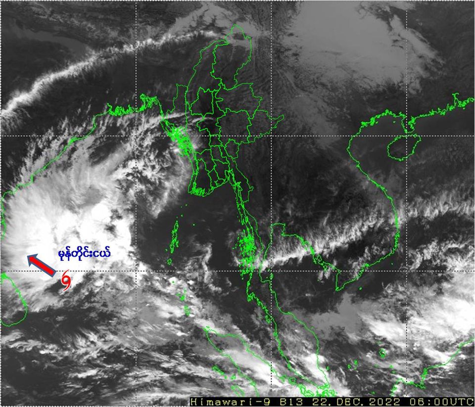 (၁) ယနေ့မြန်မာစံတော်ချိန် (၁၂:၃၀)နာရီအချိန် တိုင်းထွာချက်များအရ ဘင်္ဂလား ပင်လယ်အော်အနောက်တောင်ပိုင်းနှင့် ယင်းနှင့်ဆက်စပ်လျက်ရှိသော အီကွေတာ အနီး အိန္ဒိယသမုဒ္ဒရာအရှေ့ပိုင်းတို့တွင် ဖြစ်ပေါ်နေသော အားကောင်းသော လေဖိအားနည်းရပ်ဝန်း(Well Marked Low Pressure Area)သည် ပိုမို အားကောင်းလာကာ ဘင်္ဂလားပင်လယ်အော်အနောက်တောင်ပိုင်းတွင် မုန်တိုင်းငယ်(Depression)အဖြစ်သို့ ရောက်ရှိခဲ့ပါသည်။ အဆိုပါ မုန်တိုင်းငယ် (Depression)သည် မြန်မာနိုင်ငံ၊ ကိုကိုးကျွန်းမြို့(Coco Island)၏  အနောက် တောင်ဘက် ရေမိုင်(၅၈၀)မိုင်ခန့်၊ ဟိုင်းကြီးကျွန်းမြို့(Hainggyikyun)၏ အနောက် တောင်ဘက် ရေမိုင်(၆၉၀)မိုင်ခန့်၊ သီရိလင်္ကာနိုင်ငံ၊ ထရီကိုမာလီမြို့(Trincomalee) ၏ အရှေ့-အရှေ့မြောက်ဘက် ရေမိုင် (၂၂၅)မိုင်ခန့်၊ အိန္ဒိယနိုင်ငံ၊ နာဂါပတ္တနမ် မြို့(Nagappattinam)၏ အရှေ့-အရှေ့တောင်ဘက် ရေမိုင် (၃၅၀)မိုင်ခန့် နှင့် ချင်းနိုင်မြို့(Chennai)၏ အရှေ့တောင်ဘက် ရေမိုင် (၄၀၀)မိုင်ခန့်အကွာ ပင်လယ်ပြင်ကို ဗဟိုပြုနေပါသည်။