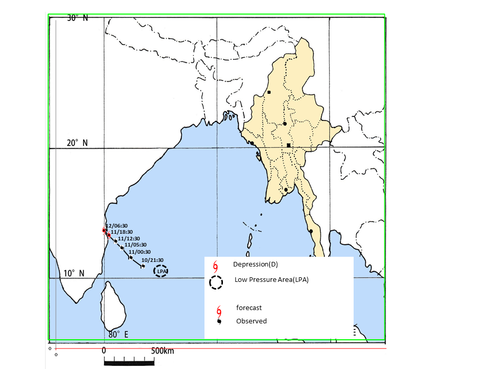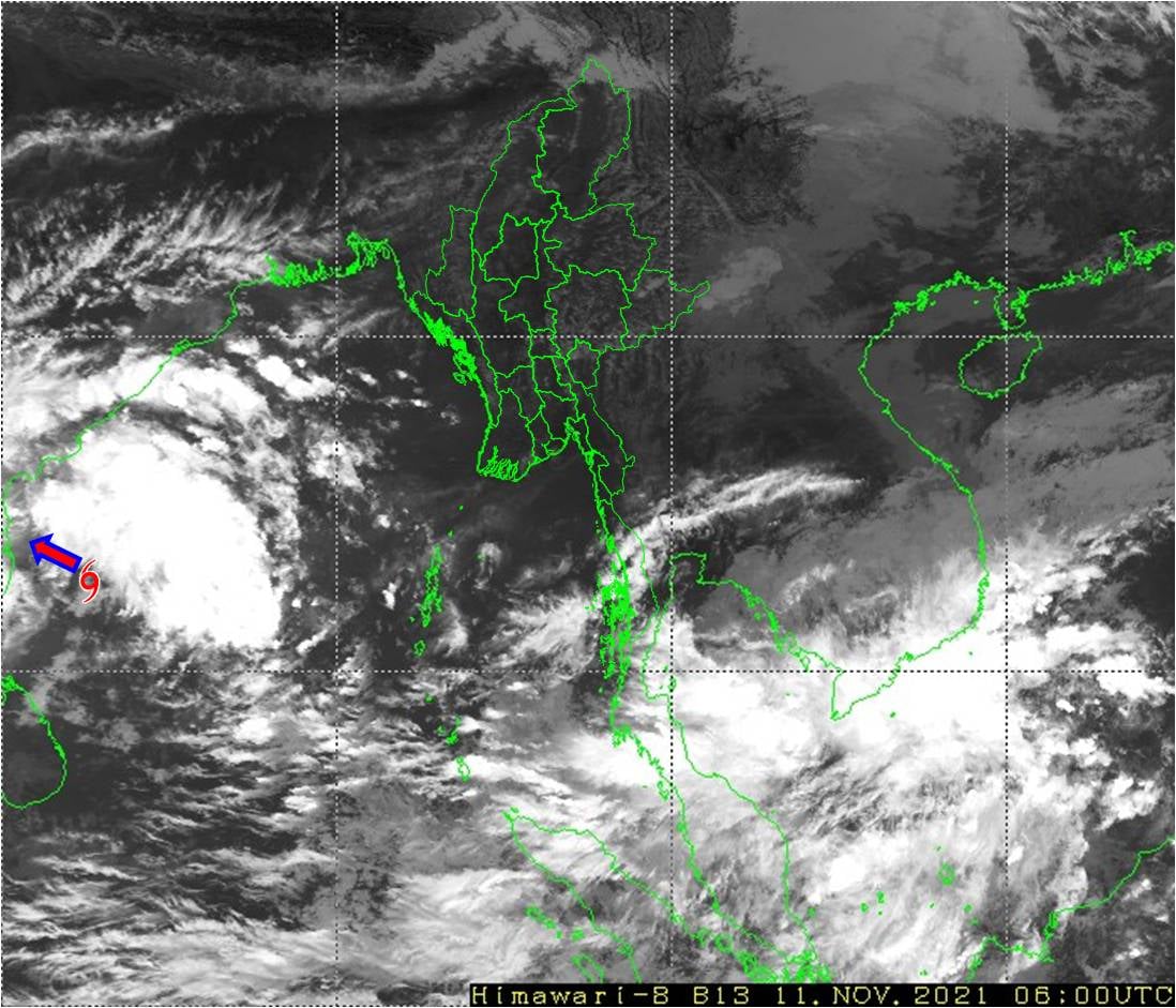 (၁) ယနေ့မြန်မာစံတော်ချိန် (၁၂:၃၀)နာရီအချိန် တိုင်းထွာချက်များအရ ဘင်္ဂလား ပင်လယ်အော် အနောက်တောင်ပိုင်းတွင် ဖြစ်ပေါ်နေသော မုန်တိုင်းငယ် (Depression)သည် အနောက်-အနောက် မြောက်ဘက်သို့ ရွေ့လျားခဲ့ပြီး ဘင်္ဂလားပင်လယ်အော်အနောက်တောင်ပိုင်းနှင့် ယင်းနှင့် ဆက်စပ်လျက် ရှိသော ဘင်္ဂလားပင်လယ်အော်အနောက်အလယ်ပိုင်းသို့ ရောက်ရှိခဲ့ကာ မြန်မာနိုင်ငံ ကိုကိုးကျွန်း(Coco Island)မြို့၏ အနောက်- အနောက်တောင် ဘက် ရေမိုင် (၇၃၅)မိုင်ခန့်၊ ဟိုင်းကြီးကျွန်း (Hainggyigyun) မြို့၏ အနောက် - အနောက်တောင်ဘက် ရေမိုင် (၈၀၅)မိုင်ခန့်၊ အိန္ဒိယနိုင်ငံ ချင်းနိုင်(Chennai) မြို့၏ အရှေ့တောင်ဘက် ရေမိုင် (၅၅)မိုင်ခန့်နှင့် ပူဒူချယ်ရီ(Puducherry) မြို့၏ အရှေ့-အရှေ့မြောက်ဘက် ရေမိုင် (၇၅)မိုင်ခန့်အကွာ ပင်လယ်ပြင်ကို ဗဟိုပြုနေပါသည်။