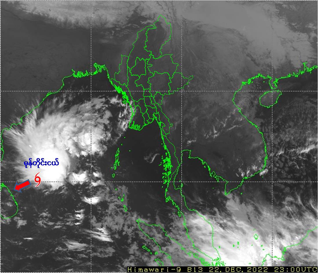 (၁) ယနေ့မြန်မာစံတော်ချိန် (၀၅:၃၀)နာရီအချိန် တိုင်းထွာချက်များအရ ဘင်္ဂလား ပင်လယ်အော်အနောက်တောင်ပိုင်းတွင် ဖြစ်ပေါ်နေသော မုန်တိုင်းငယ်(Depression) သည် အနောက်မြောက်ဘက်သို့ ရွေ့လျားခဲ့ပြီး၊ မြန်မာနိုင်ငံ၊ ကိုကိုးကျွန်းမြို့ (Coco Island)၏ အနောက်-အနောက်တောင်ဘက် ရေမိုင်(၅၉၅)မိုင်ခန့်၊ ဟိုင်းကြီးကျွန်းမြို့(Hainggyikyun)၏ အနောက်-အနောက်တောင်ဘက် ရေမိုင်(၆၉၅)မိုင်ခန့်၊ သီရိလင်္ကာနိုင်ငံ၊ ထရီကိုမာလီမြို့(Trincomalee)၏ အရှေ့-အရှေ့မြောက်ဘက် ရေမိုင် (၁၉၅)မိုင်ခန့်၊ အိန္ဒိယနိုင်ငံ၊ နာဂါပတ္တနမ် မြို့(Nagappattinam)၏ အရှေ့-အရှေ့တောင်ဘက် ရေမိုင် (၂၅၀)မိုင်ခန့် နှင့် ချင်းနိုင်မြို့(Chennai)၏ အရှေ့-အရှေ့တောင်ဘက် ရေမိုင် (၂၇၅)မိုင်ခန့် အကွာ ပင်လယ်ပြင်ကို ဗဟိုပြုနေပါသည်။