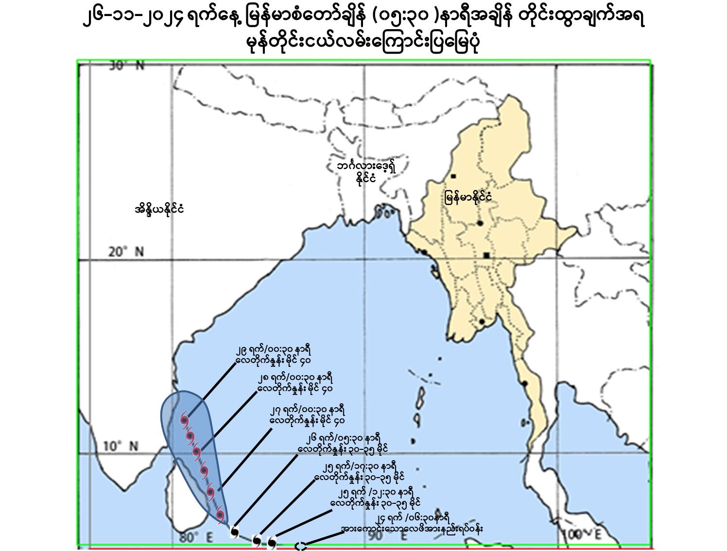 ယနေ့မြန်မာစံတော်ချိန် (၀၅:၃၀) နာရီ တိုင်းထွာချက်များအရ ဘင်္ဂလား ပင်လယ်အော် အနောက်တောင်ပိုင်းတွင် ဖြစ်ပေါ်နေသော မုန်တိုင်းငယ် (Depression) သည် အနောက်မြောက်ဘက်သို့ ရွေ့လျားခဲ့ပြီး၊ မြန်မာနိုင်ငံ၊ ကိုကိုးကျွန်းမြို့ (Coco Island) ၏ အနောက်တောင်ဘက် ရေမိုင် ၇၉၀ မိုင်ခန့်၊ အိန္ဒိယနိုင်ငံ၊ ချင်းနိုင်မြို့ (Chennai) ၏ တောင်- အရှေ့တောင်ဘက် ရေမိုင် ၄၈၀ မိုင်ခန့်အကွာ ပင်လယ်ပြင်ကို ဗဟိုပြုနေသည်။ ဗဟိုချက်လေဖိအား ၁၀၀၃ ဟက်တိုပါစကယ် နှင့် အမြင့်ဆုံးလေတိုက်နှုန်းမှာ တစ်နာရီလျှင် မိုင် ၃၀ မှ ၃၅ မိုင်နှုန်းခန့် ဖြစ်သည်။