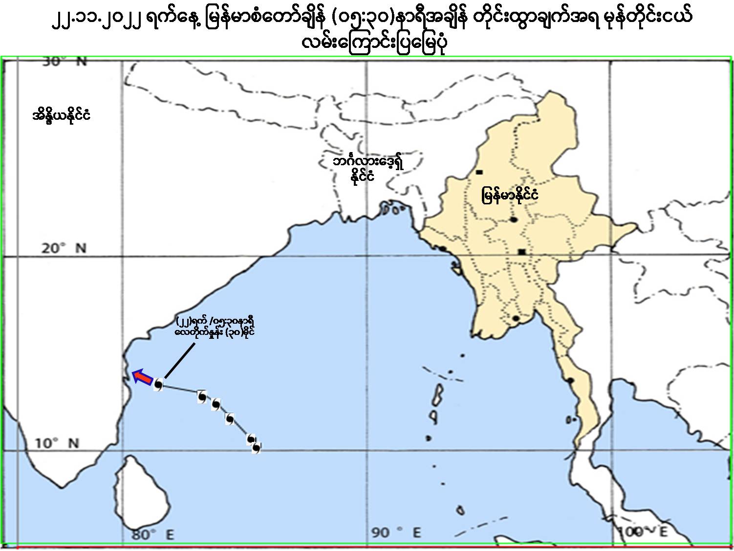 ယနေ့မြန်မာစံတော်ချိန် (၀၅:၃၀) နာရီ တိုင်းထွာချက်များအရ ဘင်္ဂလား ပင်လယ်အော် အနောက်တောင်ပိုင်းတွင် ဖြစ်ပေါ်နေသော မုန်တိုင်းငယ် (Depression) သည် အနောက်-အနောက်မြောက်ဘက်သို့ ရွေ့လျားခဲ့ပြီး၊ ဘင်္ဂလားပင်လယ်အော် အနောက်တောင်ပိုင်းနှင့် ယင်းနှင့်ဆက်စပ်လျက်ရှိသော ဘင်္ဂလားပင်လယ်အော် အနောက်အလယ်ပိုင်းသို့ ရောက်ရှိခဲ့သည်။ အဆိုပါ မုန်တိုင်းငယ် (Depression) သည် မြန်မာနိုင်ငံ၊ ကိုကိုးကျွန်းမြို့ (Coco Island) ၏ အနောက်-အနောက်တောင်ဘက် ရေမိုင် (၆၉၅) မိုင်ခန့်၊ ဟိုင်းကြီးကျွန်း မြို့ (Hainggyikyun) ၏ အနောက် - အနောက်တောင်ဘက် ရေမိုင် (၇၆၅) မိုင်ခန့်၊ အိန္ဒိယနိုင်ငံ၊ ချင်းနိုင်မြို့ (Chennai) ၏ အရှေ့ဘက် ရေမိုင် (၇၅) မိုင်ခန့်နှင့် မာချီလီပတ္တနမ်မြို့ (Machilipatnam) ၏ တောင်-အရှေ့တောင်ဘက် ရေမိုင် (၁၈၅) မိုင်ခန့်အကွာ ပင်လယ်ပြင်ကို ဗဟိုပြုနေသည်။