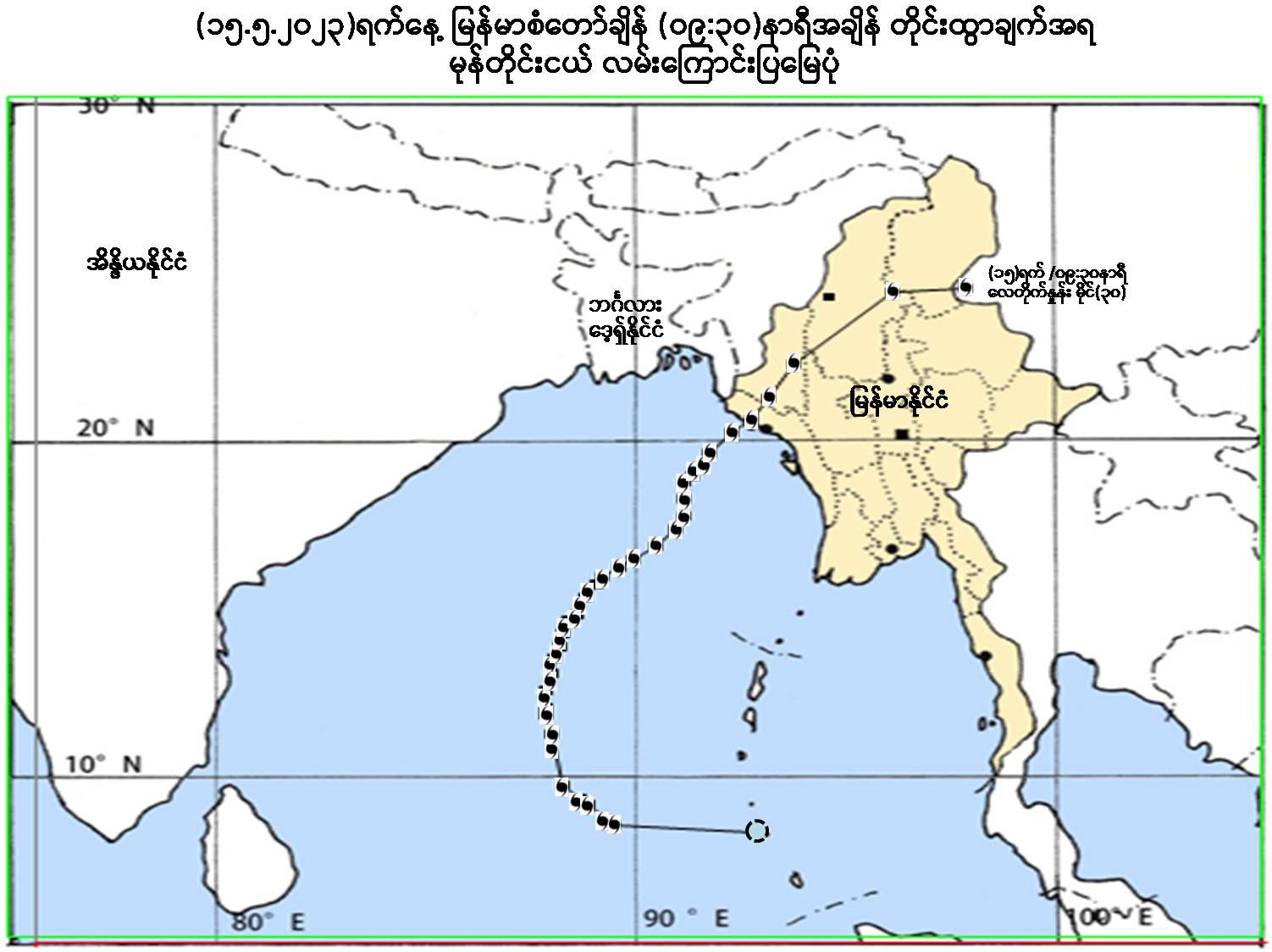 (၂) မုန်တိုင်းငယ်သည် မြန်မာနိုင်ငံမှ ဖြတ်ကျော်ခဲ့ပြီး ဖြစ်သည့်အတွက် အစိမ်းရောင်အဆင့်ဟု သတ်မှတ်ပါသည်။