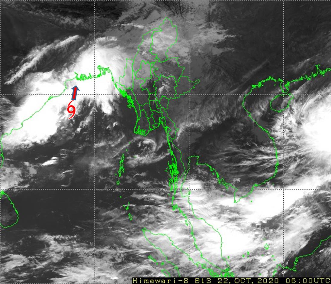 (၁) ယနေ့မြန်မာစံတော်ချိန်(၁၂:၃၀)နာရီအချိန် တိုင်းထွာချက်များအရ ဘင်္ဂလား ပင်လယ်အော်အနောက်အလယ်ပိုင်းတွင် ဖြစ်ပေါ်နေသော လေဖိအားနည်း ရပ်ဝန်းသည် ဘင်္ဂလားပင်လယ်အော် အနောက်မြောက်ပိုင်းနှင့် ယင်းနှင့်ဆက်စပ် လျက်ရှိသော ဘင်္ဂလားပင်လယ်အော် အနောက်အလယ်ပိုင်းသို့ ရောက်ရှိခဲ့ပြီး၊ မုန်တိုင်းငယ်(Depression)အဖြစ်သို့ ပိုမိုအားကောင်းလာကာ၊ အိန္ဒိယနိုင်ငံ၊ ပါရာဒစ်(Paradip)မြို့၏ တောင်-အရှေ့တောင်ဘက် ရေမိုင်(၁၀ဝ)မိုင်ခန့်၊ ဆာဂါ (Sagar)ကျွန်း၏ တောင်-အနောက်တောင်ဘက် ရေမိုင်(၁၉၀)မိုင်ခန့်၊ ဘင်္ဂလားဒေ့ရှ် နိုင်ငံ၊ ခီပူပါရာ(Khepupara)မြို့၏ တောင်-အနောက်တောင်ဘက် ရေမိုင် (၂၇၀) မိုင်ခန့်နှင့် မြန်မာနိုင်ငံ၊ မောင်တောမြို့၏ အနောက်-အနောက်တောင်ဘက် ရေမိုင် (၃၃၀)မိုင်ခန့်အကွာ ပင်လယ်ပြင်ကို ဗဟိုပြုနေပါသည်။