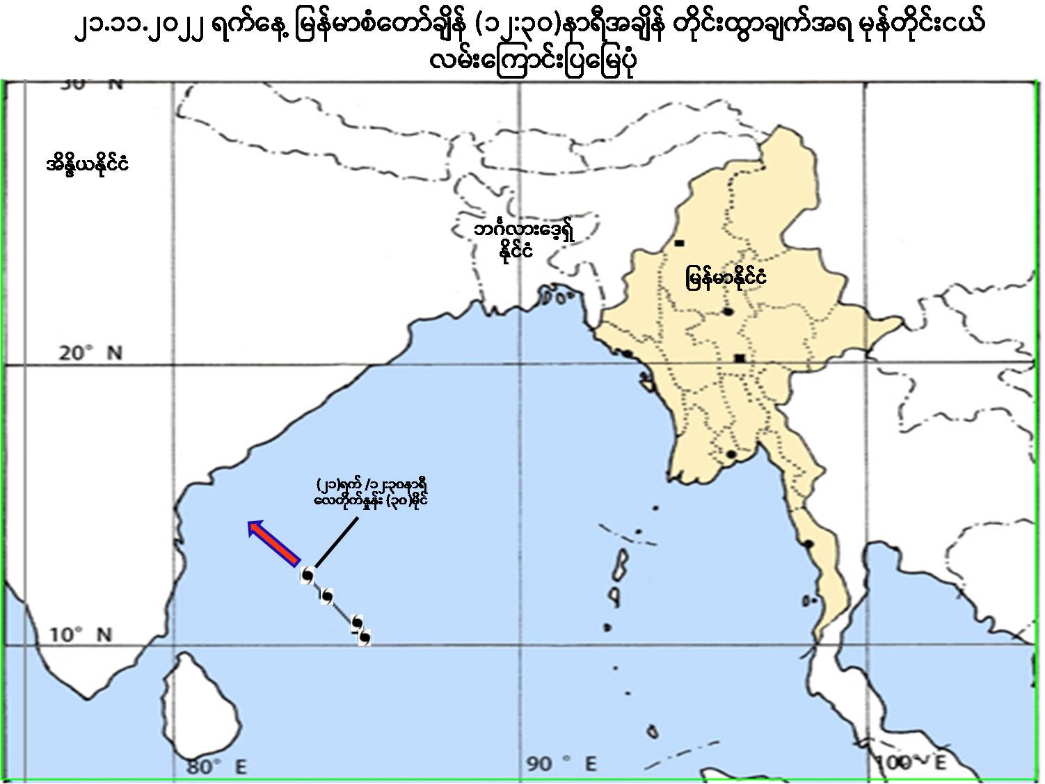 (၁) ယနေ့မြန်မာစံတော်ချိန် (၁၂:၃၀)နာရီအချိန်တိုင်းထွာချက်များအရဘင်္ဂလားပင်လယ်အော်အနောက်တောင်ပိုင်းတွင် ဖြစ်ပေါ်နေသောမုန်တိုင်းငယ် (Depression)သည် အနောက်မြောက်ဘက်သို့ ရွေ့လျားခဲ့ပြီး၊ မြန်မာနိုင်ငံ၊ ကိုကိုးကျွန်းမြို့(Coco Island)၏ အနောက်-အနောက်တောင်ဘက် ရေမိုင်(၅၇၀)မိုင်ခန့်၊ ဟိုင်းကြီးကျွန်းမြို့(Hainggyikyun)၏ အနောက်-အနောက်တောင်ဘက် ရေမိုင်(၆၆၀)မိုင်ခန့်၊ သီရိလင်္ကာနိုင်ငံ၊ ဂျက်ဖ်နာမြို့(Jaffna)၏ အရှေ့မြောက်ဘက် ရေမိုင်(၂၇၅)မိုင်ခန့်နှင့် အိန္ဒိယနိုင်ငံ၊ချင်းနိုင်မြို့(Chennai)၏ အရှေ့-အရှေ့တောင်ဘက် ရေမိုင်(၂၁၀)မိုင်ခန့်အကွာ ပင်လယ်ပြင်ကို ဗဟိုပြုနေပါသည်။