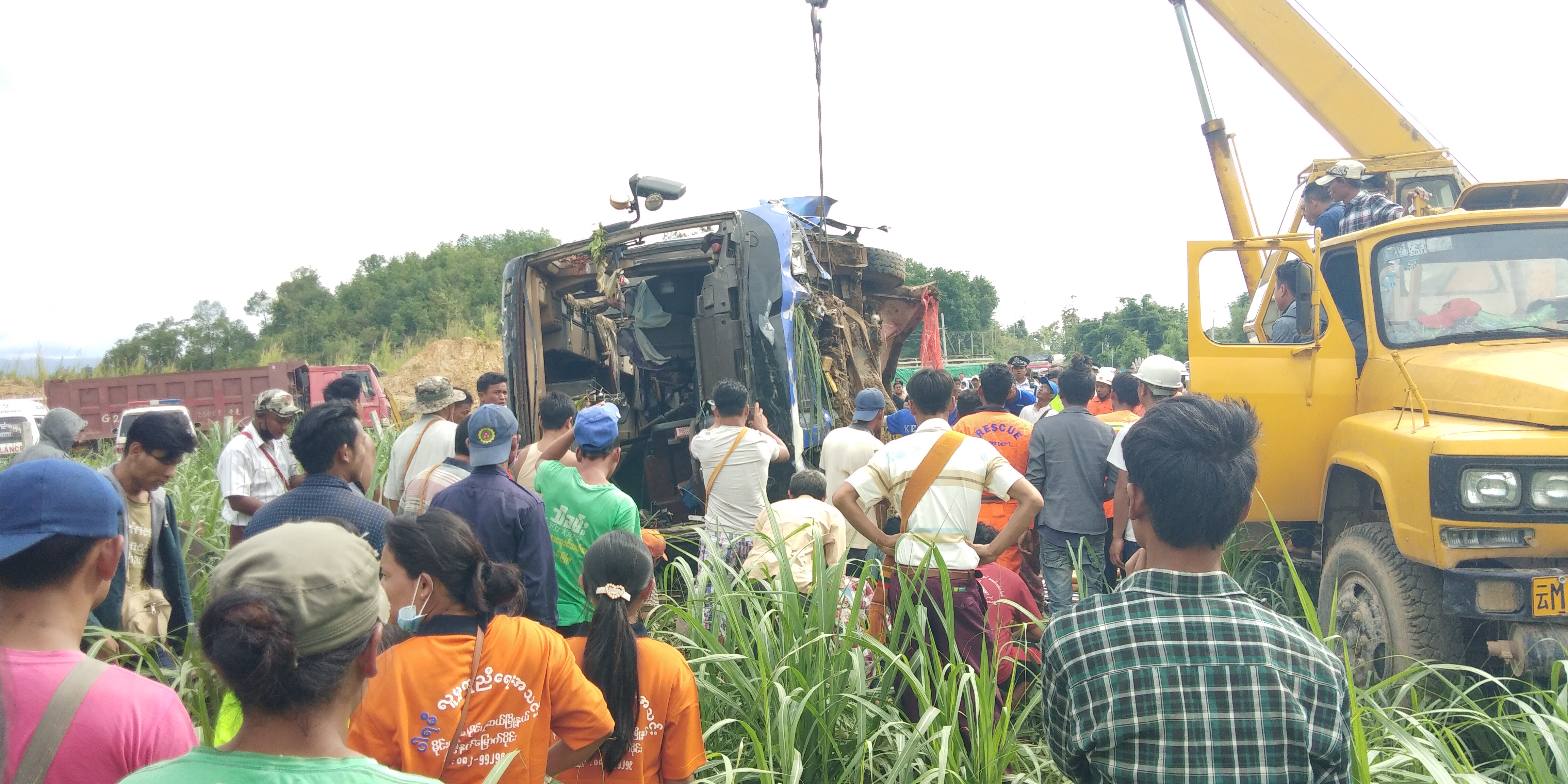 ယာဉ်တိမ်းမှောက်မှုကြောင့် ယာဉ်ပေါ်ပါ ခရီးသည် တစ်ဦးနှင့် ယာဉ်နောက်လိုက်တစ်ဦး သေဆုံးခဲ့ပြီး ခရီးသည် (၁၇)ဦးဒဏ်ရာရရှိခဲ့ကြောင်းသိရပြီး ဖြစ်စဉ်ကို သက်ဆိုင်ရာမှ စစ်ဆေးဆောင်ရွက်နေကြောင်း သိရသည်။