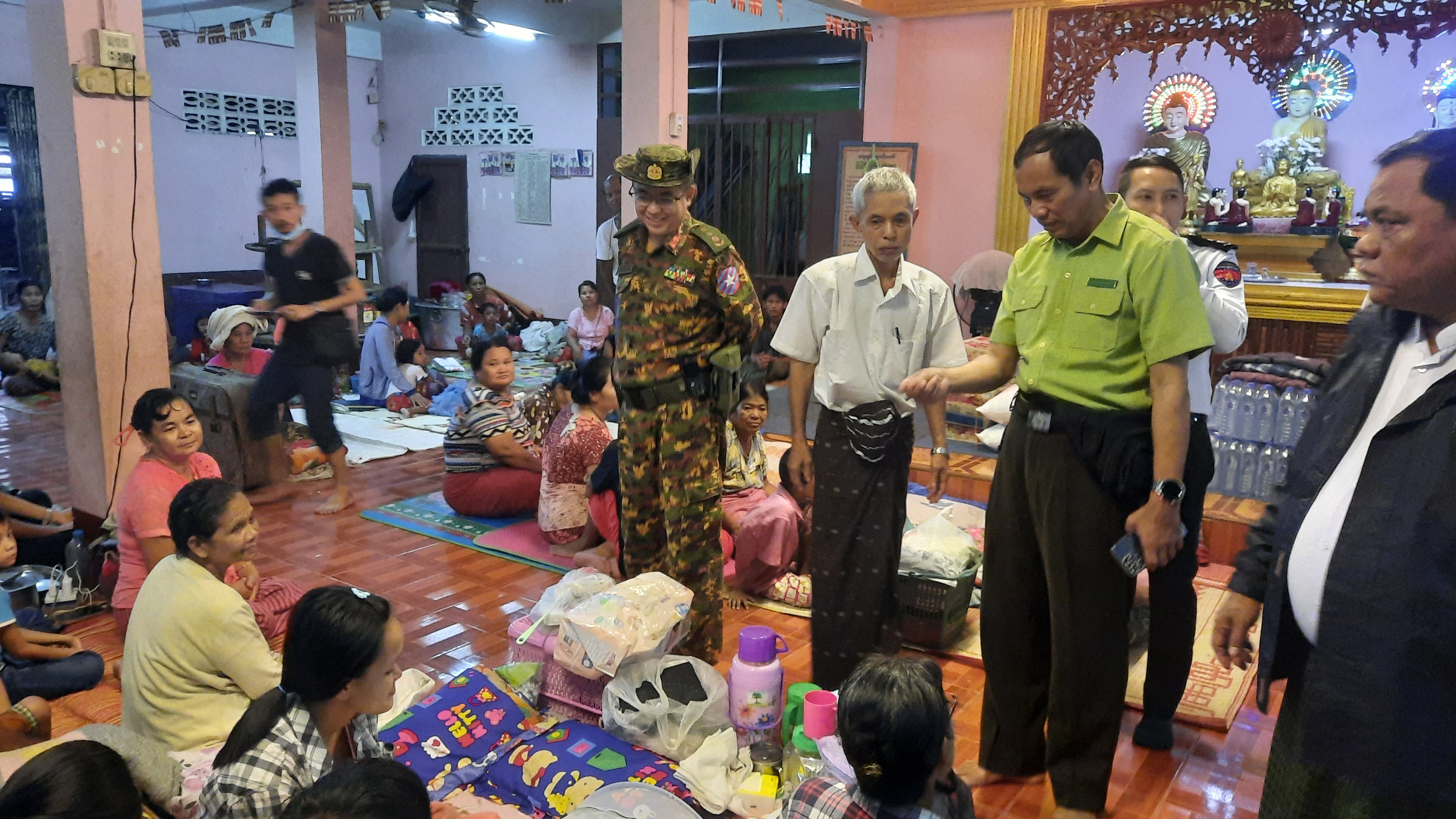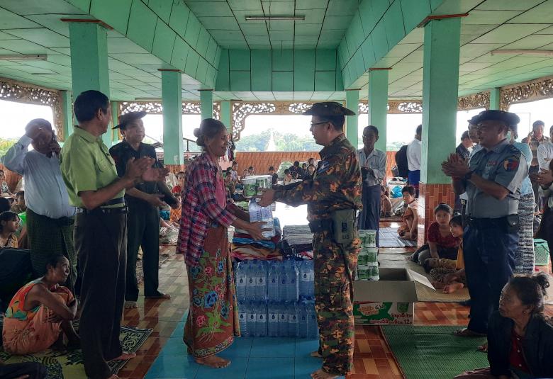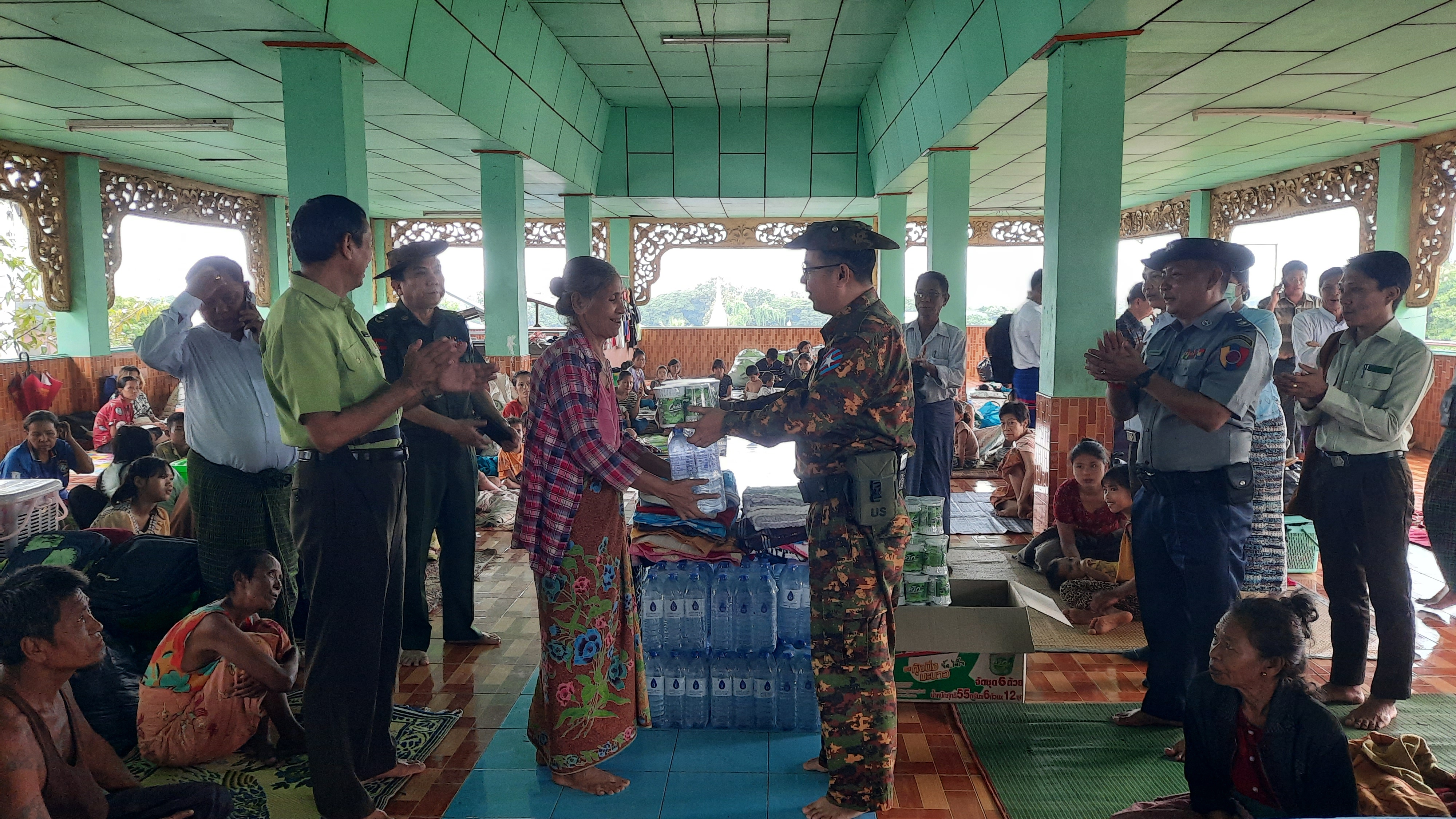 အဆိုပါ ရေဘေးရှောင် ပြည်သူများအား သင်္ဃန်းညီနောင် အခြေချစစ်ဗျူဟာမှ စစ်ဗျူဟာမှူး ဗိုလ်မှူးကြီးထွန်းထွန်းလတ်၊  ခရိုင်စီမံအုပ်ချုပ်ရေးအဖွဲ့ဥက္ကဋ္ဌ ခရိုင်အုပ်ချုပ်ရေးမှူး ဦးစိုးတင့်နှင့် အဖွဲ့ဝင်များ ခရိုင်ရဲတပ်ဖွဲ့မှူး ဒုတိယရဲမှူးကြီးအောင်ထက်ဝင်းနှင့်တာဝန်ရှိသူများက ထောက်ပံ့ရေးပစ္စည်းများကို သွားရောက်ပေးအပ်သည်။