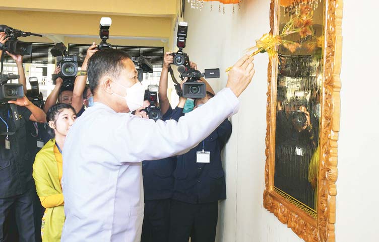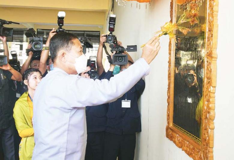 ယင်းနောက် နိုင်ငံတော် စီမံအုပ်ချုပ်ရေးကောင်စီ ဥက္ကဋ္ဌ နိုင်ငံတော်ဝန်ကြီးချုပ် ဗိုလ်ချုပ်မှူးကြီး မင်းအောင်လှိုင်က Naypyitaw State Academy ဆိုင်းဘုတ်ကို စက်ခလုတ်နှိပ် ဖွင့်လှစ်ပေးပြီး Nay-pyitaw State Academy ကမ္ပည်းမော်ကွန်းကို အမွှေးနံ့သာရည်များ ပက်ဖျန်းပေးသည်။