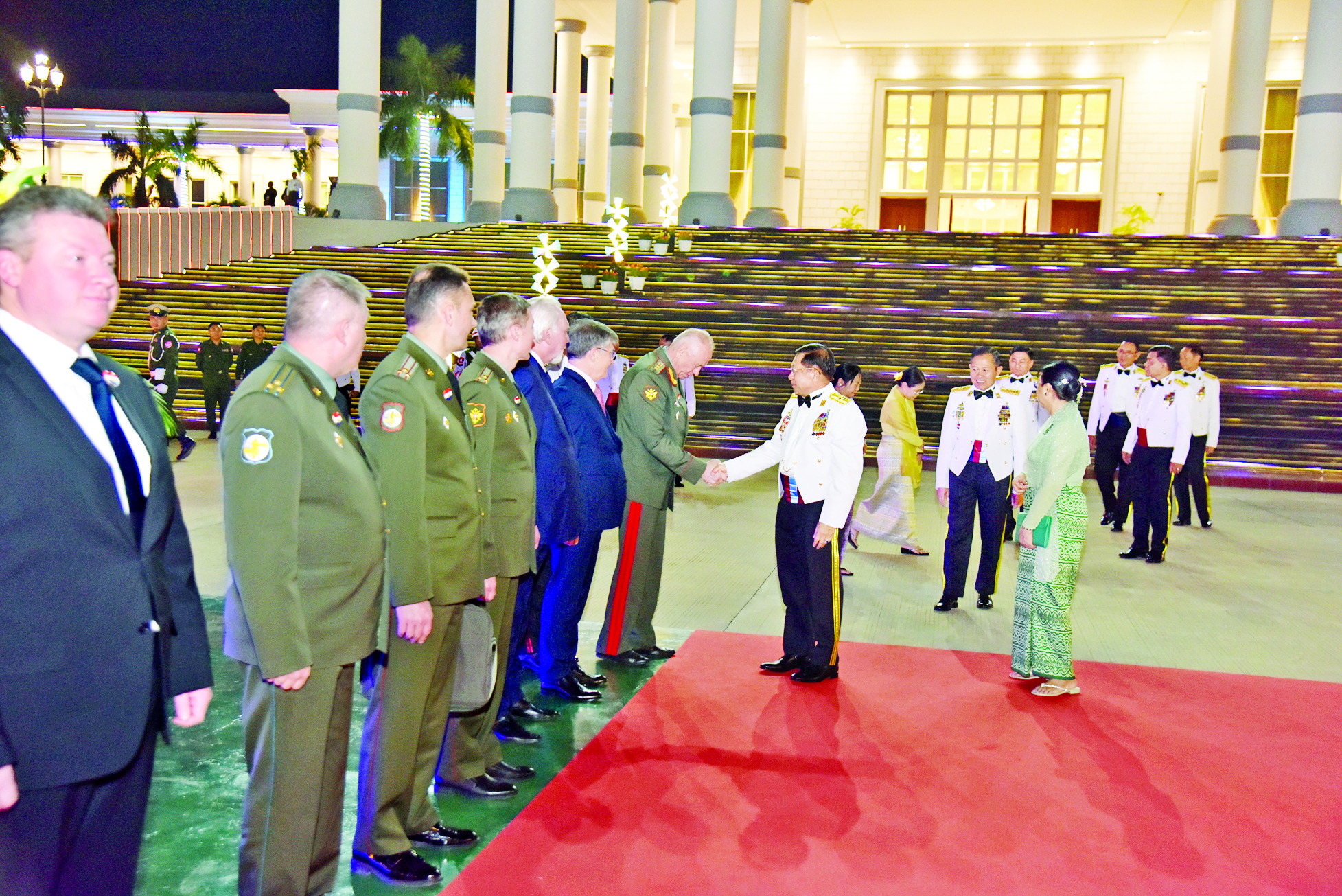 ထို့နောက် နိုင်ငံတော်စီမံအုပ်ချုပ်ရေးကောင်စီဥက္ကဋ္ဌ တပ်မတော်ကာကွယ်ရေးဦးစီးချုပ် ဗိုလ်ချုပ်မှူးကြီး မင်းအောင်လှိုင်နှင့် ဇနီးဒေါ်ကြူကြူလှတို့သည် နှစ် (၈၀) ပြည့်တပ်မတော်နေ့ အထိမ်းအမှတ် အကြိုဂုဏ်ပြုညစာစားပွဲသို့ တက်ရောက်လာကြသည့် ရုရှားဖက်ဒရေးရှင်းနိုင်ငံ ဒုတိယကာကွယ်ရေးဝန်ကြီး Colonel General Alexander Vasilyevich Fomin နှင့် အဖွဲ့ဝင်များ၊ နိုင်ငံတော်စီမံအုပ်ချုပ်ရေး ကောင်စီဒုတိယဥက္ကဋ္ဌ ဒုတိယတပ်မတော်ကာကွယ်ရေးဦးစီးချုပ် ကာကွယ်ရေးဦးစီးချုပ်(ကြည်း) ဒုတိယဗိုလ်ချုပ်မှူးကြီး စိုးဝင်းနှင့် ဇနီးဒေါ်သန်းသန်းနွယ်၊ ညှိနှိုင်း ကွပ်ကဲရေးမှူး (ကြည်း၊ ရေ၊ လေ) ဗိုလ်ချုပ်ကြီးကျော်စွာလင်းနှင့်ဇနီး၊ ကာကွယ်ရေးဦးစီးချုပ် (ရေ) ဗိုလ်ချုပ်ကြီး ထိန်ဝင်းနှင့်ဇနီး၊ ကာကွယ်ရေးဦးစီးချုပ် (လေ) ဗိုလ်ချုပ်ကြီး ထွန်းအောင်နှင့်ဇနီး၊ ကောင်စီအတွင်းရေးမှူးနှင့်ဇနီး၊ တွဲဖက်အတွင်းရေးမှူးနှင့်ဇနီး၊ ကောင်စီဝင်များနှင့်ဇနီးများ၊ ပြည်ထောင်စုအဆင့်ပုဂ္ဂိုလ်များ၊ ပြည်ထောင်စုဝန်ကြီးများနှင့်ဇနီးများ၊ ကာကွယ်ရေးဦးစီးချုပ်ရုံးမှ အဆင့်မြင့် တပ်မတော်အရာရှိကြီးများနှင့် ဇနီးများ၊ ရဲဘော်သုံးကျိပ်ဝင် မိသားစုဝင်များ၊ အငြိမ်းစား တပ်မတော်ကာကွယ်ရေးဦးစီးချုပ်များ၏ မိသားစုဝင်များ၊ အငြိမ်းစားတပ်မတော် (ကြည်း၊ ရေ၊ လေ) အရာရှိကြီးများ၊ လွတ်လပ်ရေးမော်ကွန်းဝင် ပထမအဆင့်၊ ဒုတိယအဆင့်နှင့် တတိယအဆင့် မော်ကွန်းဝင်ပုဂ္ဂိုလ်များ၊ အကြံပေးပုဂ္ဂိုလ်များ၊ ဒုတိယဝန်ကြီးများ၊ တပ်မတော်သား အငြိမ်းစား သံအမတ်ကြီးများ၊ နေပြည်တော်ကောင်စီဝင်များ၊ နိုင်ငံခြားစစ်သံရုံးများမှ စစ်သံမှူးများနှင့် တာဝန်ရှိသူများ၊ တစ်နိုင်ငံလုံး ပစ်ခတ်တိုက်ခိုက်မှုရပ်စဲရေး သဘောတူစာချုပ် (NCA) လက်မှတ် ရေးထိုးထားသည့် တိုင်းရင်းသားလက်နက်ကိုင်အဖွဲ့များမှ ကိုယ်စားလှယ်များ၊ နိုင်ငံရေးပါတီများမှ ဥက္ကဋ္ဌများနှင့် တာဝန်ရှိသူများ၊ အောင်ဆန်းသူရိယဘွဲ့ ရရှိခဲ့သူများ၏ မိသားစုဝင်များနှင့် ဆွေမျိုးများ၊ သီဟသူရဘွဲ့၊ သူရဘွဲ့နှင့် တပ်မတော်စွမ်းရည်သတ္တိဆိုင်ရာ ဂုဏ်ထူးဆောင်ဘွဲ့၊ သူရဲကောင်း မှတ်တမ်းဝင် တံဆိပ်ရရှိခဲ့ကြသည့် အရာရှိ၊ စစ်သည်များနှင့် မိသားစုဝင်များ၊ ဆွေမျိုးများ၊ မြန်မာနိုင်ငံစစ်မှုထမ်းဟောင်းအဖွဲ့ဝင်များ၊ အသွင်ပြောင်း ပြည်သူ့စစ်၊ မူလပြည်သူ့စစ်နှင့် နယ်ခြားစောင့် ဗဟိုအကြံပေး ကွပ်ကဲရေးအဖွဲ့များ၊ မြန်မာနိုင်ငံရဲတပ်ဖွဲ့၊ မီးသတ်တပ်ဖွဲ့နှင့် မြန်မာနိုင်ငံ ကြက်ခြေနီတပ်ဖွဲ့တို့မှပုဂ္ဂိုလ်များ၊ ဝန်ကြီးဌာနအသီးသီးမှ တာဝန်ရှိသူများနှင့် ဝန်ထမ်းများ၊ ဝိုင်အမ်ဘီအေအသင်းကြီး၊ မြန်မာနိုင်ငံအမျိုးသမီးရေးရာအဖွဲ့ချုပ်၊ မြန်မ