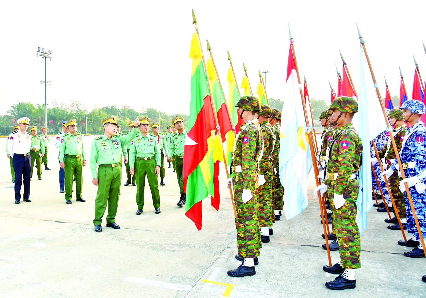 မတ် ၂၇ ရက်တွင် ကျရောက်မည့် နှစ် (၈၀) ပြည့် တပ်မတော်နေ့ စစ်ရေးပြအခမ်းအနားတွင် ပါဝင်ချီတက် စစ်ရေးပြကြမည့် စစ်ရေးပြစစ်ကြောင်းကြီးများသည် ယနေ့နံနက်ပိုင်းတွင် နေပြည်တော် စစ်ရေးပြကွင်း၌ ဝတ်စုံပြည့် စစ်ရေးပြလေ့ကျင့်မှုများ ဆောင်ရွက်ကြရာ နိုင်ငံတော်စီမံအုပ်ချုပ်ရေး ကောင်စီ ဒုတိယဥက္ကဋ္ဌ ဒုတိယတပ်မတော်ကာကွယ်ရေးဦးစီးချုပ် ကာကွယ်ရေးဦးစီးချုပ်(ကြည်း) ဒုတိယဗိုလ်ချုပ်မှူးကြီးစိုးဝင်း ကြည့်ရှုစစ်ဆေးသည်။