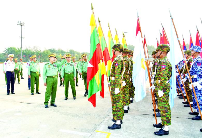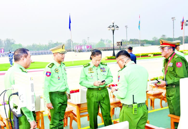ဆက်လက်၍ နိုင်ငံတော်စီမံအုပ်ချုပ်ရေးကောင်စီ ဒုတိယဥက္ကဋ္ဌ ဒုတိယတပ်မတော် ကာကွယ်ရေးဦးစီးချုပ် ကာကွယ်ရေးဦးစီးချုပ် (ကြည်း) နှင့် အဖွဲ့ဝင်များသည် တပ်မတော်လေမှ လေယာဉ်၊ ရဟတ်ယာဉ်များ၏ အချိန်ကိုက် အုပ်ဖွဲ့ပျံသန်းလေ့ကျင့်မှုများ၊ အလံတော်အဖွဲ့နှင့် စစ်ကြောင်းတပ်ခွဲများ၏ ဝတ်စားဆင်ယင်မှုဆိုင်ရာများ၊ စစ်ရေးပြအလံများ၊ စစ်ရေးပြ လက်နက်ငယ်များနှင့် စစ်ဝတ်တန်ဆာများ ပြင်ဆင်ထားရှိမှုနှင့် စစ်ရေးပြတပ်ခွဲအသီးသီး၏ စစ်ရေးပြ လှုပ်ရှားမှုများကို အသေးစိတ်လိုက်လံကြည့်ရှုစစ်ဆေးပြီး လိုအပ်သည်များကို တာဝန်ရှိသူများနှင့် ပေါင်းစပ်ညှိနှိုင်းဆောင်ရွက်ပေးသည်။