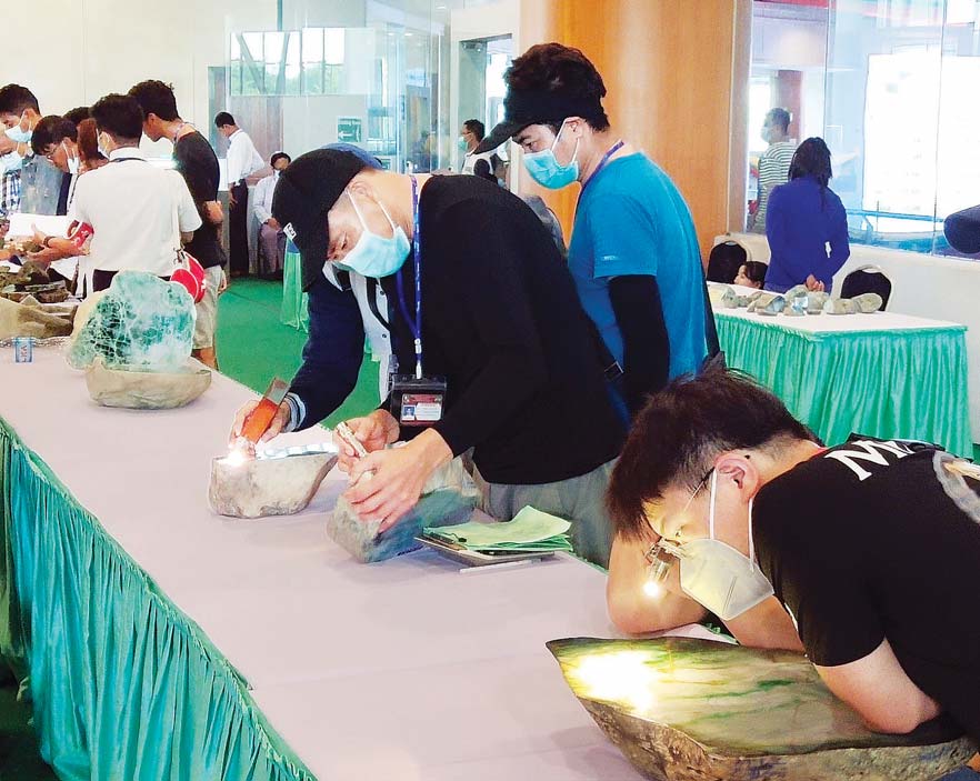 မွန်းလွဲပိုင်းတွင် မြန်မာ့ကျောက်မျက်ရတနာပြပွဲ ဗဟိုကော်မတီ နာယက သယံဇာတနှင့် သဘာဝပတ်ဝန်းကျင် ထိန်းသိမ်းရေးဝန်ကြီးဌာန ပြည်ထောင်စုဝန်ကြီး ဉီးခင်မောင်ရီနှင့် ပြပွဲဗဟိုကော်မတီဝင်များသည် မဏိရတနာ ကျောက်စိမ်းခန်းမအတွင်းရှိ ကျောက်စိမ်းအတွဲများ အိတ်ဖွင့်တင်ဒါစနစ်ဖြင့် ရောင်းချပေးနေမှုကို ကြည့်ရှု အားပေးသည်။