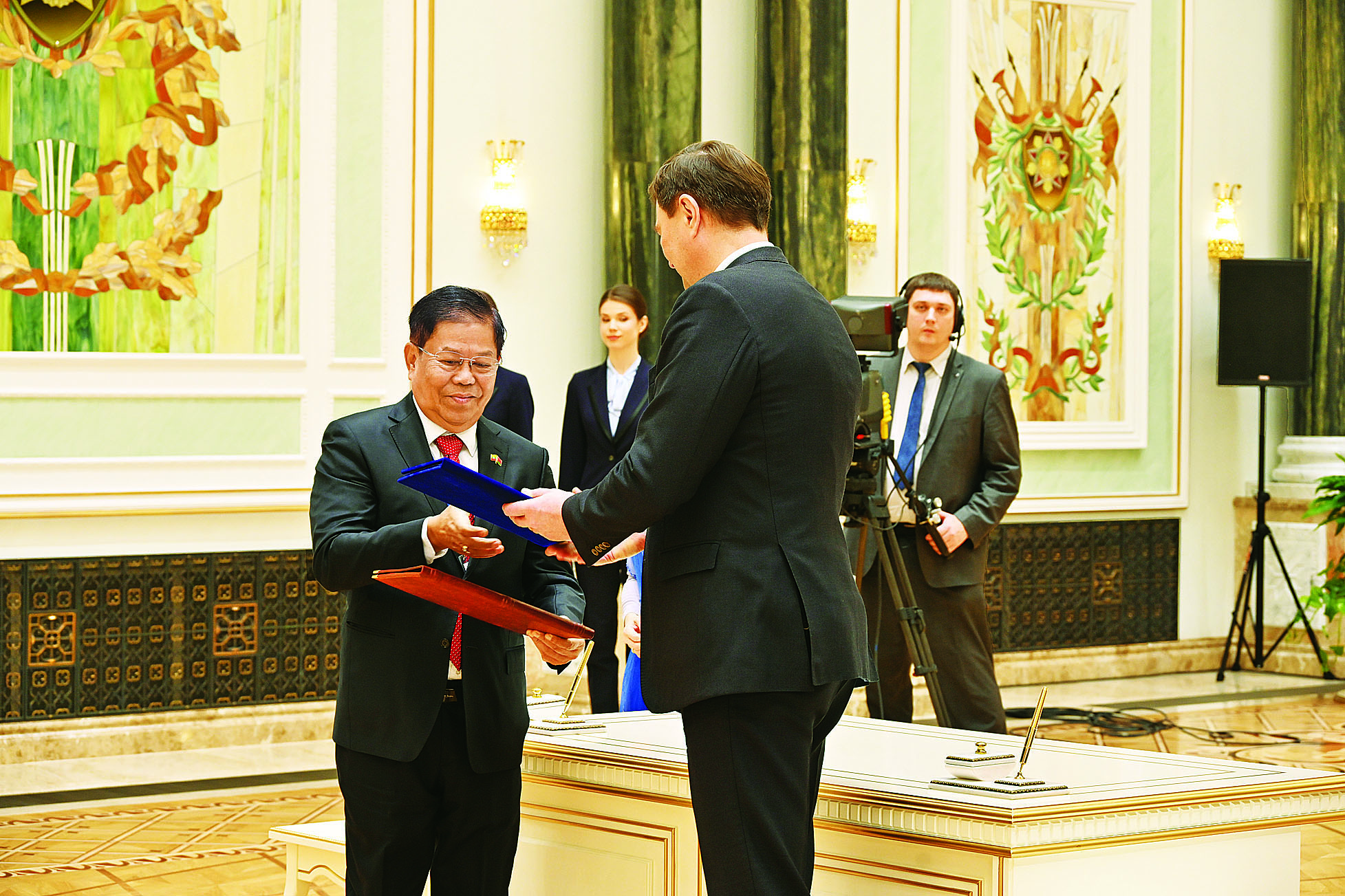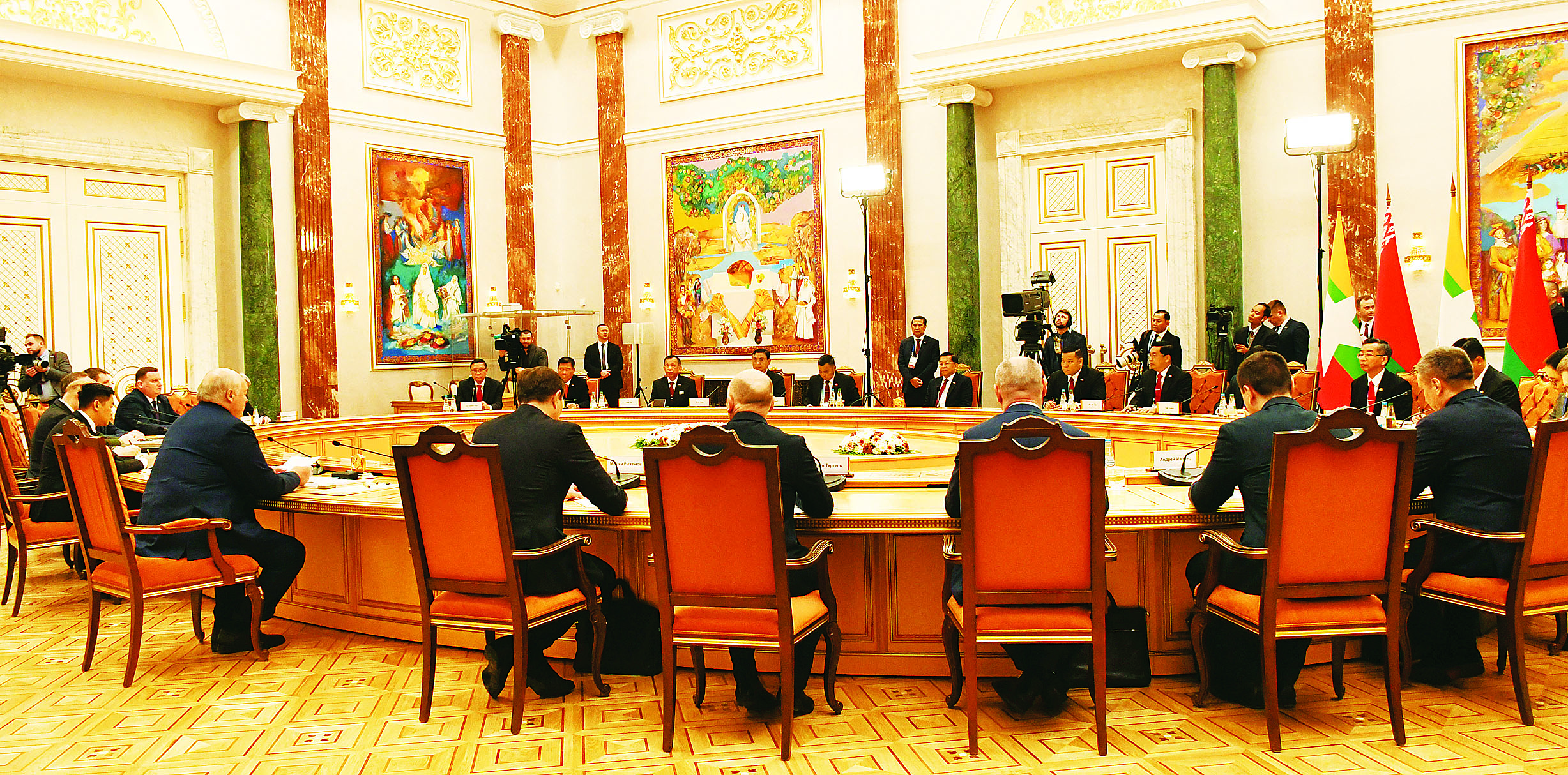 မြန်မာ-ဘယ်လာရုစ် နှစ်နိုင်ငံ နိုင်ငံတော်အဆင့်တွေ့ဆုံဆွေးနွေးပွဲကို ယနေ့ဒေသစံတော်ချိန် မွန်းလွဲပိုင်းတွင် ဘယ်လာရုစ်နိုင်ငံ မင့်စ်မြို့ရှိ သမ္မတနန်းတော်အစည်းအဝေးခန်းမ၌ ကျင်းပပြုလုပ်ရာ နိုင်ငံတော်စီမံအုပ်ချုပ်ရေးကောင်စီ ဥက္ကဋ္ဌ နိုင်ငံတော်ဝန်ကြီးချုပ် ဗိုလ်ချုပ်မှူးကြီး မင်းအောင်လှိုင်နှင့် ဘယ်လာရုစ်သမ္မတနိုင်ငံ သမ္မတ H.E. Mr. Alexander Gregoryevich Lukashenko တို့ တက်ရောက်ဆွေးနွေးကြသည်။