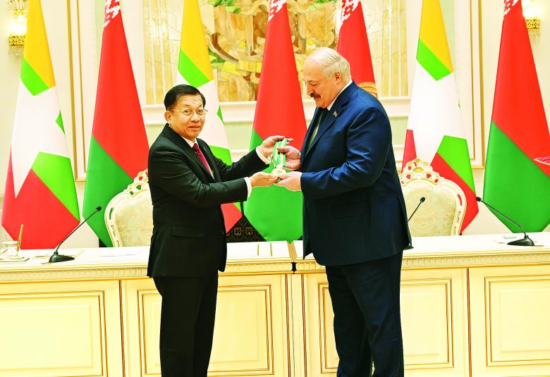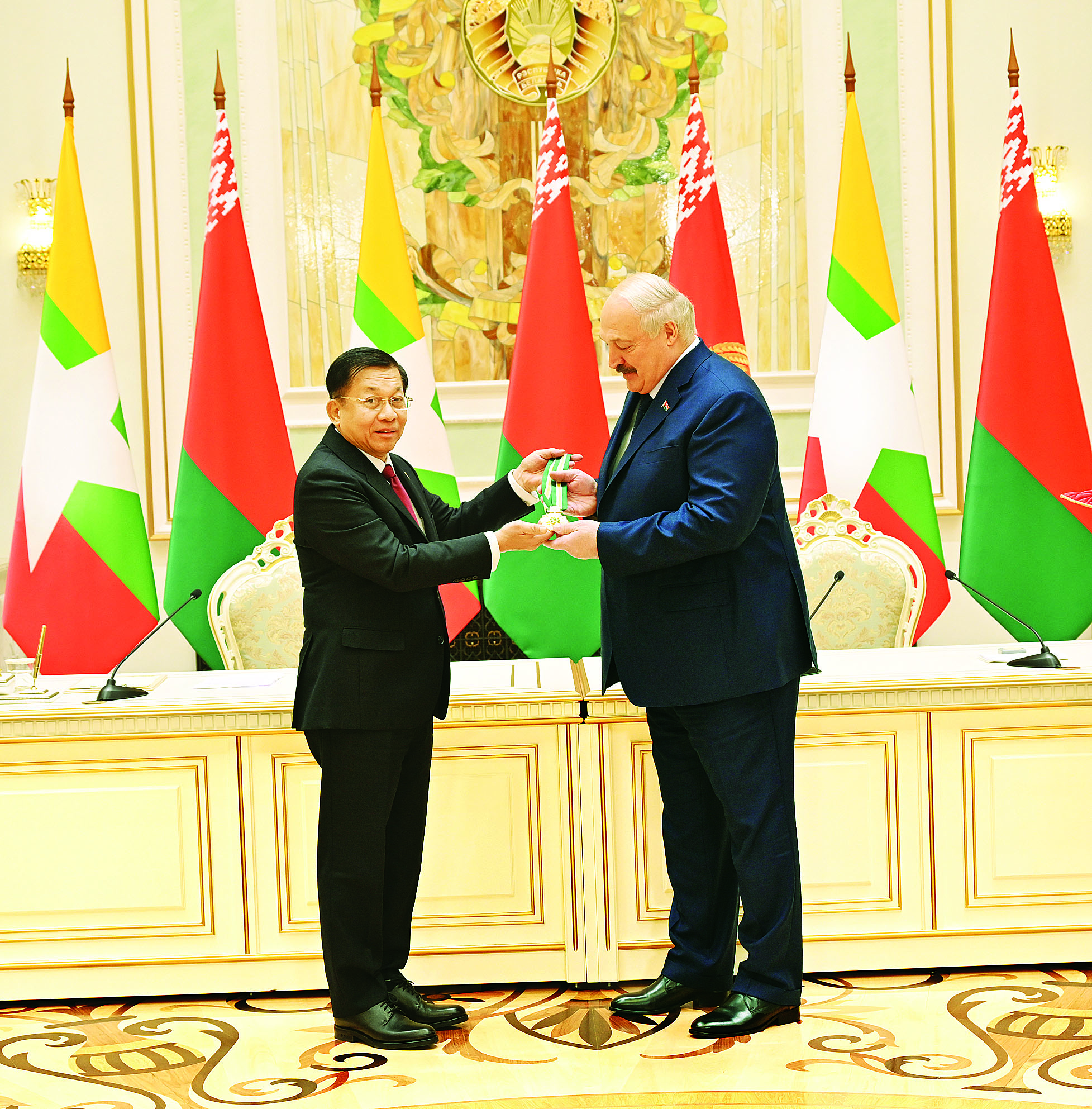 ဆက်လက်၍ နိုင်ငံတော်စီမံအုပ်ချုပ်ရေးကောင်စီ ဥက္ကဋ္ဌ နိုင်ငံတော်ဝန်ကြီးချုပ် ဗိုလ်ချုပ်မှူးကြီး မင်းအောင်လှိုင်သည် ဘယ်လာရုစ်သမ္မတနိုင်ငံ သမ္မတ H.E. Mr. Alexander Gregor-yevich Lukashenko အား အဂ္ဂမဟာ သရေစည်သူဘွဲ့ကို ချီးမြှင့်အပ်နှင်းသည်။