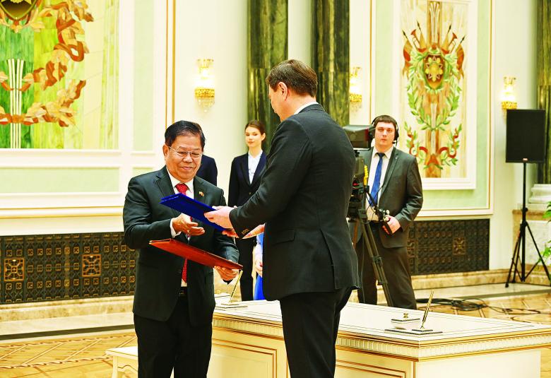 ယင်းနောက် နှစ်နိုင်ငံအစိုးရနှစ်ရပ်အကြား သဘောတူညီချက်များနှင့် နားလည်မှုစာချွန်လွှာများ လက်မှတ်ရေးထိုးလဲလှယ်ခြင်း အခမ်းအနားကို ဆက်လက်ကျင်းပပြုလုပ်ရာ ဒုတိယဝန်ကြီးချုပ်နှင့် နိုင်ငံခြားရေးဝန်ကြီးဌာန ပြည်ထောင်စုဝန်ကြီး ဦးသန်းဆွေနှင့် ဘယ်လာရုစ်သမ္မတနိုင်ငံ နိုင်ငံခြားရေးဝန်ကြီးတို့က နှစ်နိုင်ငံအကြား၊ အစိုးရများအကြား ပူးပေါင်းဆောင်ရွက်မှုဆိုင်ရာ စာချွန်လွှာများ၊ အားကစားကဏ္ဍ၊ ခရီးသွားကဏ္ဍ၊ ဥပဒေရေးရာ ပူးပေါင်းဆောင်ရွက်ရေး၊ စိုက်ပျိုးရေးနှင့် အစားအစာဘေးအန္တရာယ် ကင်းရှင်းရေးကဏ္ဍများတွင် ပူးပေါင်းဆောင်ရွက်ရေး နားလည်မှုစာချွန်လွှာများကို လဲလှယ်ကြသည်။