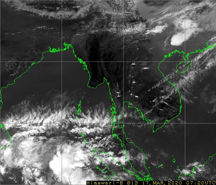 ဘင်္ဂလားပင်လယ်အော်အခြေအနေ။ ကပ္ပလီပင်လယ်ပြင်နှင့် ဘင်္ဂလားပင်လယ်အော်တောင်ပိုင်းတို့တွင် တိမ်အသင့်အတင့်မှ တိမ်ထူထပ်နေပြီး၊ ကျန်ဘင်္ဂလားပင်လယ်အော်တွင် တိမ်အနည်းငယ် ဖြစ်ထွန်းနေပါသည်။