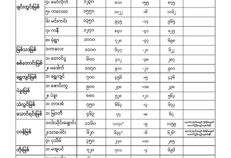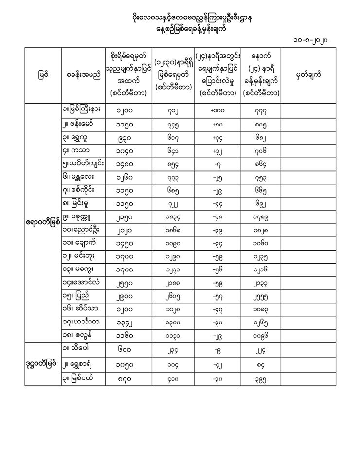 မိုးလေဝသနှင့်ဇလဗေဒညွှန်ကြားမှုဦးစီးဌာနမှ (၁၀.၈.၂၀၂၀) ရက်နေ့တွင် ထုတ်ပြန်သည့် နေ့စဉ်မြစ်ရေခန့်မှန်းချက်များကို အောက်ပါအတိုင်း ဖော်ပြထားပါတယ်။