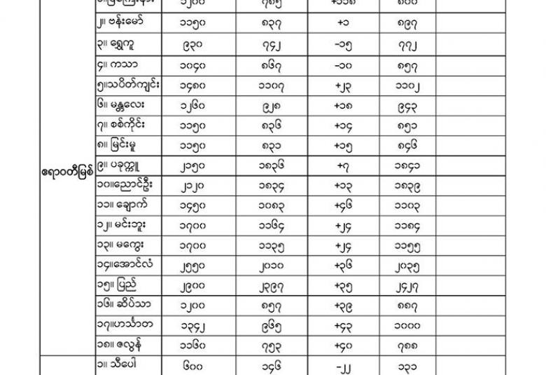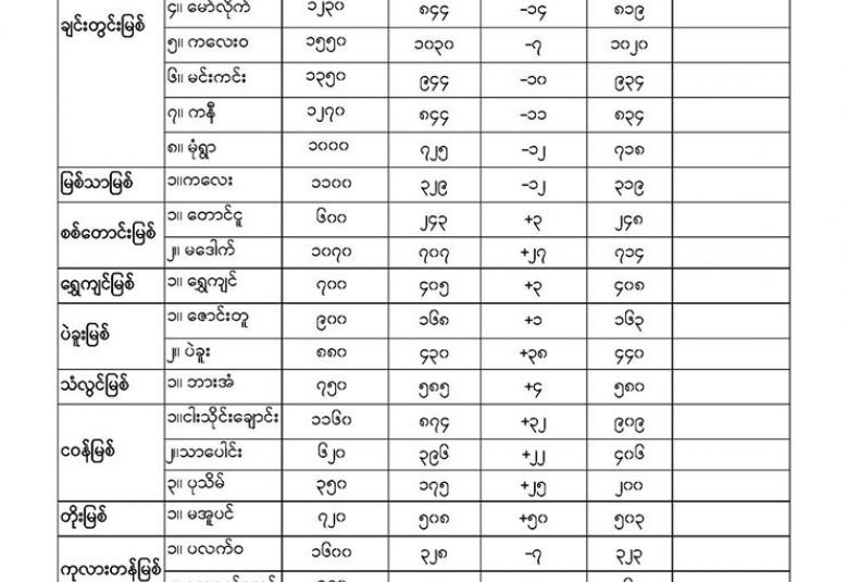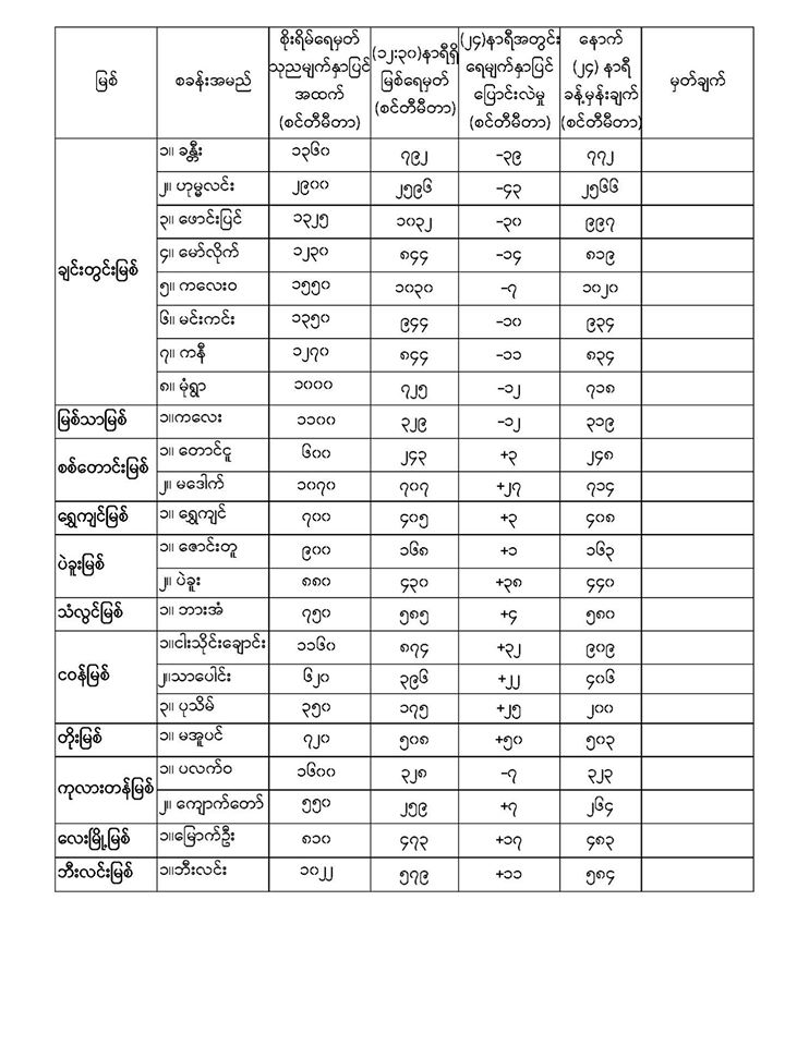Jun 28,2020 |02:15 | နေပြည်တော် ၂၈ ဇွန် မိုးလေဝသနှင့်ဇလဗေဒညွန်ကြားမှုဦးစီးဌာနမှ (၂၈.၆.၂၀၂၀) ရက်နေ့တွင် ထုတ်ပြန်သည့် နေ့စဉ်မြစ်ရေခန့်မှန်းချက်များကို အောက်ပါအတိုင်း ဖော်ပြထားပါတယ်။ Crd-မိုးလေဝသနှင့်ဇလဗေဒညွှန်ကြားမှုဦးစီးဌာန
