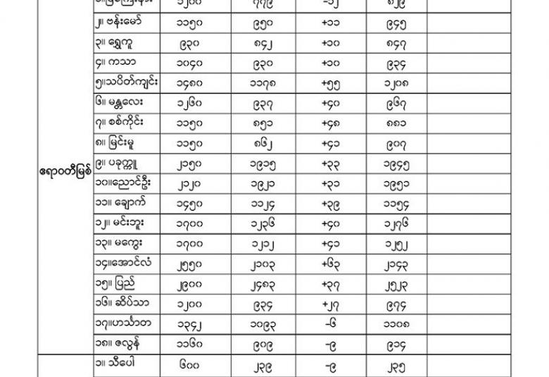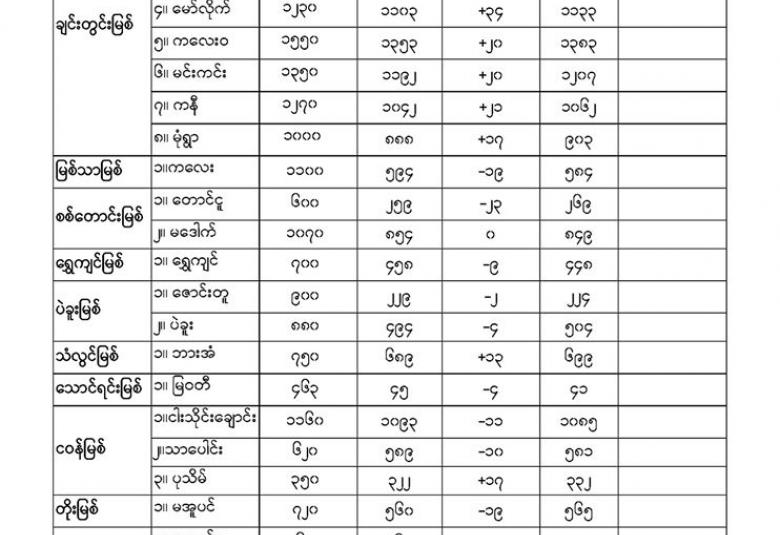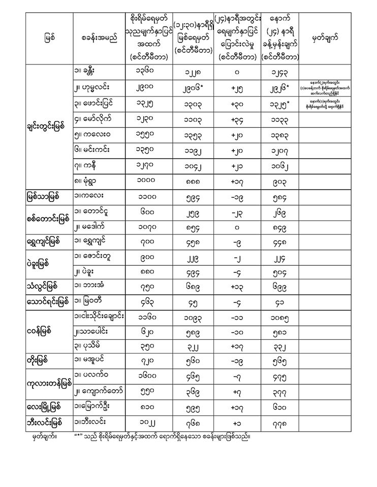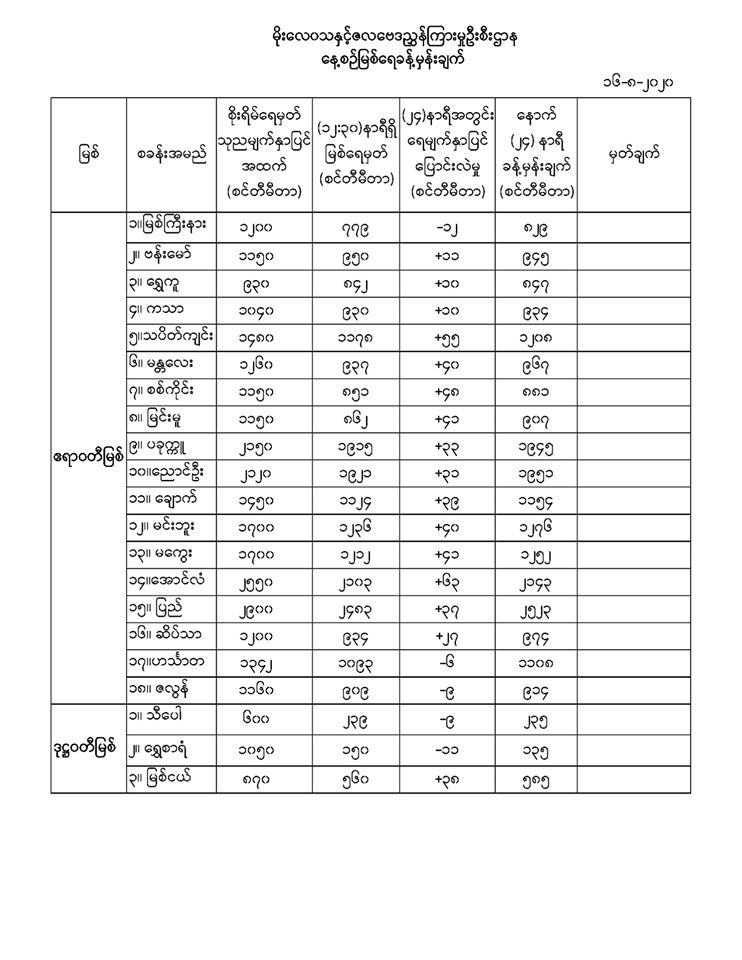 Aug 16,2020 |02:01 | နေပြည်တော် ၁၆ ဩဂုတ် မိုးလေဝသနှင့်ဇလဗေဒညွန်ကြားမှုဦးစီးဌာနမှ (၁၆.၈.၂၀၂၀) ရက်နေ့တွင် ထုတ်ပြန်သည့် နေ့စဉ်မြစ်ရေခန့်မှန်းချက်များကို အောက်ပါအတိုင်း ဖော်ပြထားပါတယ်။ Crd-မိုးလေဝသနှင့်ဇလဗေဒညွှန်ကြားမှုဦးစီးဌာန