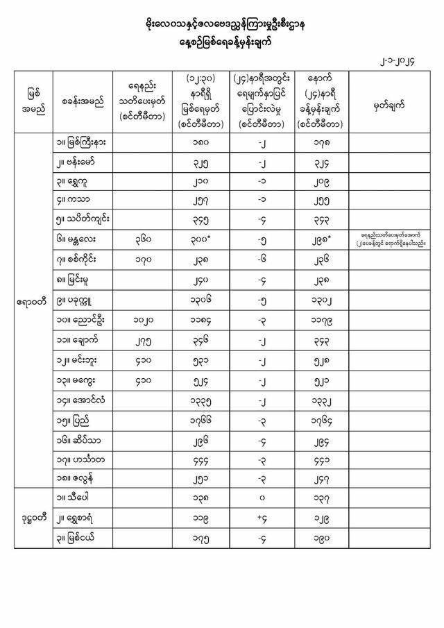 Jan 2,2024 |01:48 | (၂.၁.၂၀၂၄) မိုးလေဝသနှင့်ဇလဗေဒညွှန်ကြားမှုဦးစီးဌာနမှ (၂.၁.၂၀၂၄) ရက်နေ့တွင် ထုတ်ပြန်သည့် နေ့စဉ်မြစ်ရေခန့်မှန်းချက်များကို အောက်ပါအတိုင်း ဖော်ပြလိုက်ပါတယ်... Crd> မိုး/ဇလ