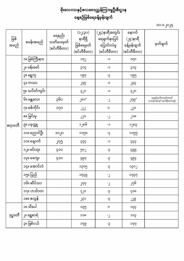 Jan 10,2024 |01:46 | (၁၀.၁.၂၀၂၄) မိုးလေဝသနှင့်ဇလဗေဒညွှန်ကြားမှုဦးစီးဌာနမှ (၁၀.၁.၂၀၂၄) ရက်နေ့တွင် ထုတ်ပြန်သည့် နေ့စဉ်မြစ်ရေခန့်မှန်းချက်များကို အောက်ပါအတိုင်း ဖော်ပြလိုက်ပါတယ်.. Crd> မိုး/ဇလ