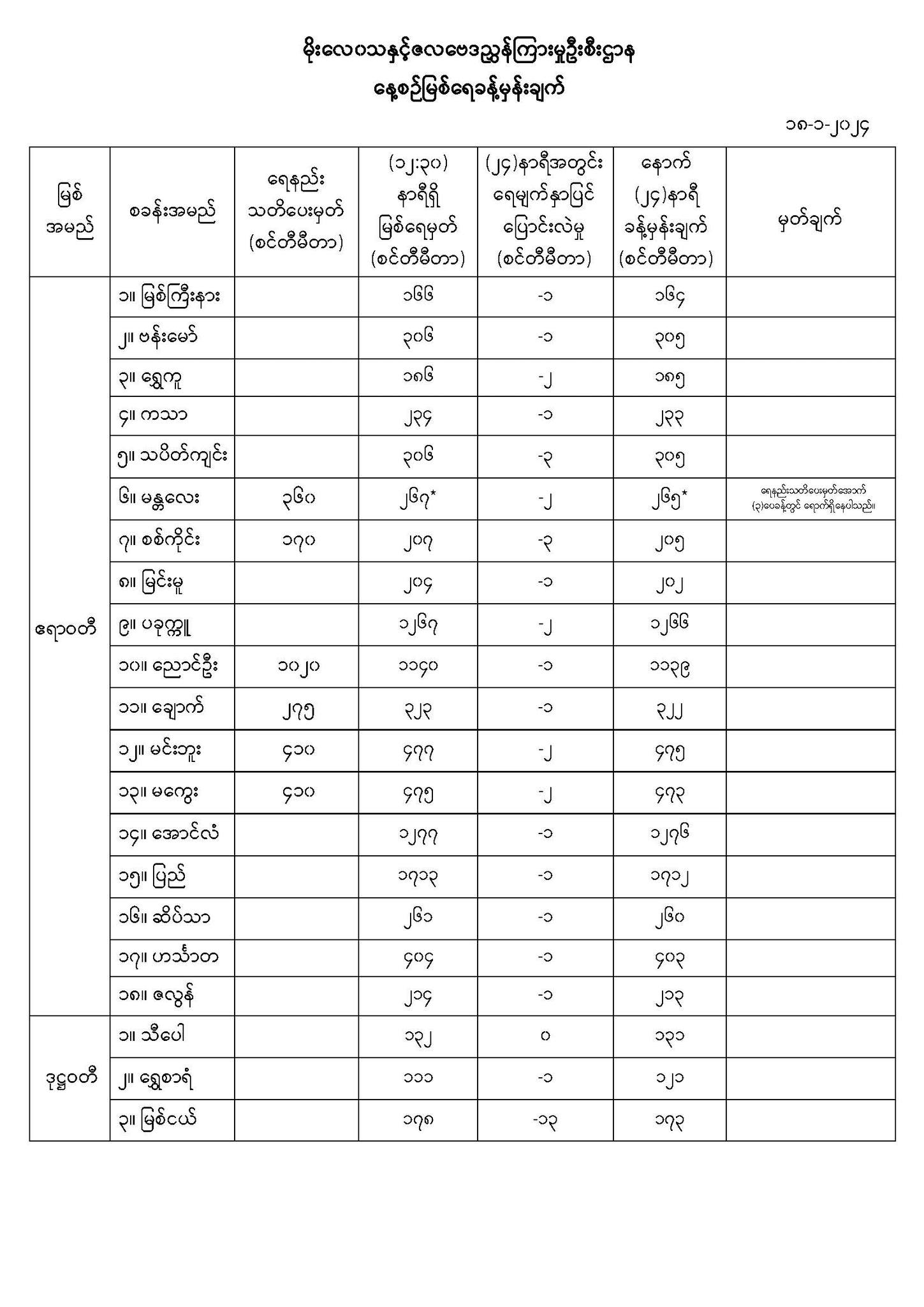 Jan 18,2024 |01:40 | (၁၈.၁.၂၀၂၄) မိုးလေဝသနှင့်ဇလဗေဒညွှန်ကြားမှုဦးစီးဌာနမှ (၁၈.၁.၂၀၂၄) ရက်နေ့တွင် ထုတ်ပြန်သည့် နေ့စဉ်မြစ်ရေ ခန့်မှန်းချက်များကို အောက်ပါအတိုင်း ဖော်ပြလိုက်ပါတယ်... Crd> မိုး/ဇလ