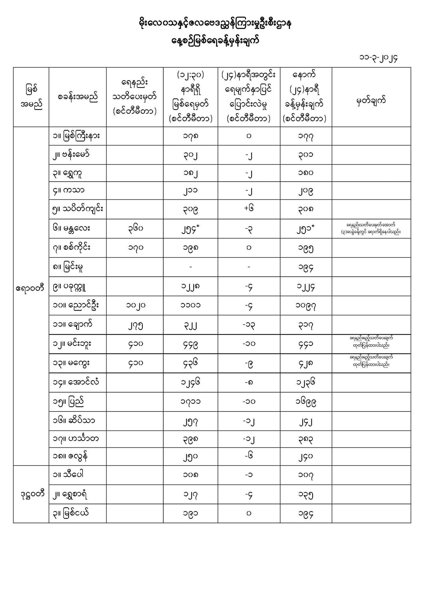 Mar 11,2024 |01:52 | (၁၁.၃.၂၀၂၄) မိုးလေဝသနှင့်ဇလဗေဒညွှန်ကြားမှုဦးစီးဌာနမှ (၁၁.၃.၂၀၂၄) ရက်နေ့တွင် ထုတ်ပြန်သည့် နေ့စဉ်မြစ်ရေခန့်မှန်းချက်များကို အောက်ပါအတိုင်း ဖော်ပြလိုက်ပါတယ်... Crd> မိုး/ဇလ