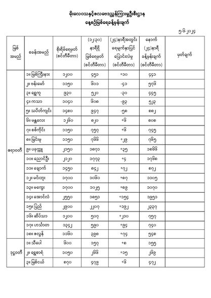 Jun 5,2024 |02:26 | ၅-၆-၂၀၂၄ မိုးလေဝသနှင့်ဇလဗေဒညွှန်ကြားမှုဦးစီးဌာနမှ ၅-၆-၂၀၂၄ ရက်နေ့တွင် ထုတ်ပြန်သည့် နေ့စဉ်မြစ်ရေခန့်မှန်းချက်များကို ဖော်ပြလိုက်ပါတယ်... Crd> မိုး/ဇလ