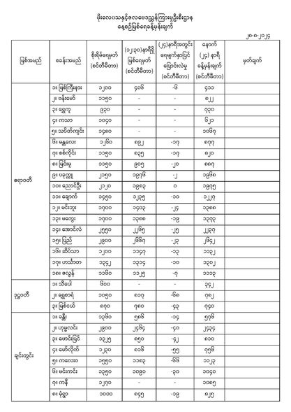 Aug 28,2024 |02:51 | ၂၈-၈-၂၀၂၄ မိုးလေဝသနှင့်ဇလဗေဒညွှန်ကြားမှုဦးစီးဌာနမှ ၂၈-၈-၂၀၂၄ ရက်နေ့တွင် ထုတ်ပြန်သည့် နေ့စဉ်မြစ်ရေခန့်မှန်းချက်များကို ဖော်ပြလိုက်ပါတယ်... Crd> မိုး/ဇလ
