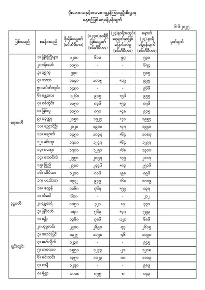 Jun 6,2025 |02:55 | ၆-၆-၂၀၂၅ မိုးလေဝသနှင့်ဇလဗေဒညွှန်ကြားမှုဦးစီးဌာနမှ ၆-၆-၂၀၂၅ ရက်နေ့တွင် ထုတ်ပြန်သည့် နေ့စဉ်မြစ်ရေခန့်မှန်းချက်များကို ဖော်ပြလိုက်ပါတယ်... Crd> မိုး/ဇလ
