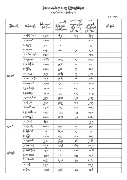Jul 3,2025 |03:13 | ၃-၇-၂၀၂၅ မိုးလေဝသနှင့်ဇလဗေဒညွှန်ကြားမှုဦးစီးဌာနမှ ၃-၇-၂၀၂၅ ရက်နေ့တွင် ထုတ်ပြန်သည့် နေ့စဉ်မြစ်ရေခန့်မှန်းချက်များကို ဖော်ပြလိုက်ပါတယ်... Crd> မိုး/ဇလ