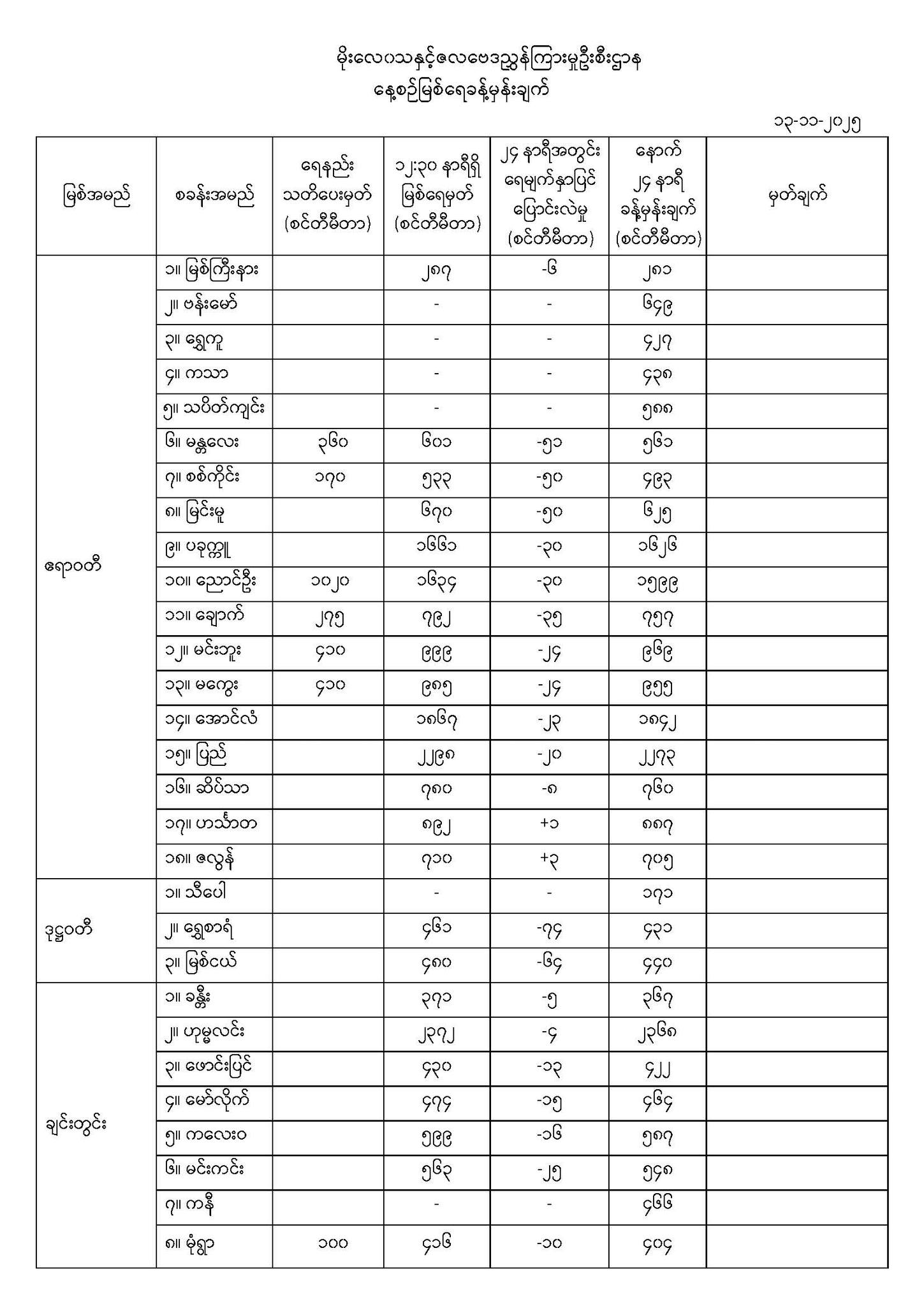 Nov 13,2025 |11:59 | ၁၃-၁၁-၂၀၂၅ မိုးလေဝသနှင့်ဇလဗေဒညွှန်ကြားမှုဦးစီးဌာနမှ ၁၃-၁၁-၂၀၂၅ ရက်နေ့တွင် ထုတ်ပြန်သည့် နေ့စဉ်မြစ်ရေခန့်မှန်းချက်များကို ဖော်ပြလိုက်ပါတယ်... Crd> မိုး/ဇလ