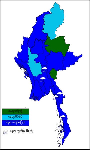 မနက်ဖြန်နံနက်အထိခန့်မှန်းချက်။ ကယားပြည်နယ်နှင့် ရှမ်းပြည်နယ်(မြောက်ပိုင်း)တို့တွင် နေရာကျဲကျဲ၊ မကွေးတိုင်းဒေသကြီးနှင့် ကချင်ပြည်နယ်တို့တွင် နေရာစိပ်စိပ်နှင့် ကျန်တိုင်းဒေသကြီးနှင့် ပြည်နယ်တို့တွင် နေရာအနှံ့အပြား မိုးထစ်ချုန်းရွာပြီး၊ နေပြည်တော်၊ ပဲခူးတိုင်းဒေသကြီး၊ တနင်္သာရီတိုင်း ဒေသကြီး၊ ကရင်ပြည်နယ်နှင့် မွန်ပြည်နယ်တို့တွင် နေရာကွက်၍ မိုးကြီးနိုင်ပါသည်။ ရွာရန်ရာနှုန်းပြည့် ဖြစ်ပါသည်။