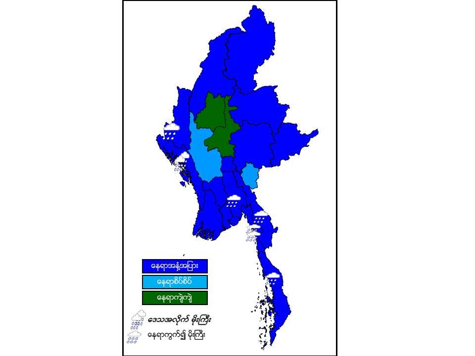 မနက်ဖြန်နံနက်အထိခန့်မှန်းချက်။ စစ်ကိုင်းတိုင်းဒေသကြီးအောက်ပိုင်းနှင့် မန္တလေးတိုင်းဒေသကြီးတို့တွင် နေရာကျဲကျဲ၊ မကွေးတိုင်း ဒေသကြီးနှင့် ကယားပြည်နယ်တို့တွင် နေရာစိပ်စိပ်နှင့် ကျန်တိုင်းဒေသကြီးနှင့် ပြည်နယ်တို့တွင် နေရာအနှံ့အပြား မိုးထစ်ချုန်းရွာပြီး၊ ရခိုင်ပြည်နယ်နှင့် မွန်ပြည်နယ်တို့တွင် ဒေသအလိုက်နှင့် ပဲခူးတိုင်းဒေသကြီး၊ တနင်္သာရီတိုင်းဒေသကြီး၊ ချင်းပြည်နယ်နှင့် ကရင်ပြည်နယ် တို့တွင် နေရာကွက်၍ မိုးကြီးနိုင်ပါသည်။ ရွာရန်ရာနှုန်းပြည့် ဖြစ်ပါသည်။