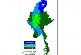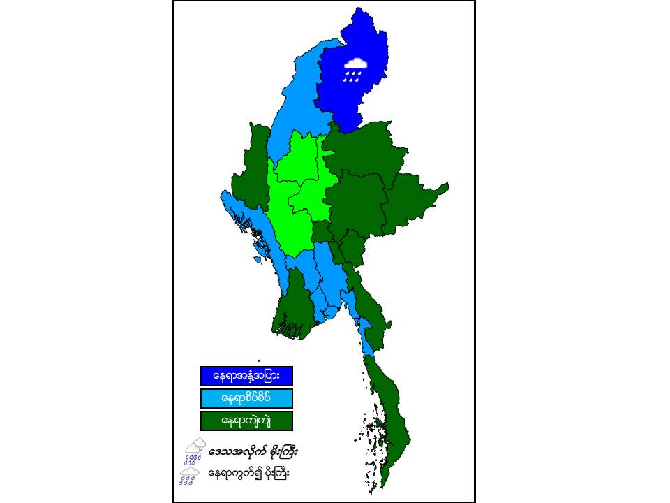 မနက်ဖြန်နံနက်အထိ ခန့်မှန်းချက်။ ကချင်ပြည်နယ်တွင် နေရာအနှံ့အပြား၊ စစ်ကိုင်းတိုင်းဒေသကြီးအထက်ပိုင်း၊ ပဲခူးတိုင်းဒေသကြီး၊ ရန်ကုန်တိုင်းဒေသကြီး၊ ရခိုင်ပြည်နယ်နှင့် မွန်ပြည်နယ်တို့တွင် နေရာစိပ်စိပ်၊ နေပြည်တော်၊ ဧရာဝတီတိုင်းဒေသကြီး၊ တနင်္သာရီတိုင်းဒေသကြီး၊ ရှမ်းပြည်နယ်၊ ချင်းပြည်နယ်၊ ကယားပြည်နယ်နှင့် ကရင်ပြည်နယ်တို့တွင် နေရာကျဲကျဲနှင့် ကျန်တိုင်းဒေသကြီးနှင့်ပြည်နယ်တို့တွင် နေရာကွက်ကျား မိုးထစ်ချုန်းရွာပြီး၊ ကချင်ပြည်နယ်တွင် နေရာကွက်၍ မိုးကြီးနိုင်ပါသည်။ ရွာရန်ရာနှုန်း(၈၀) ဖြစ်ပါသည်။