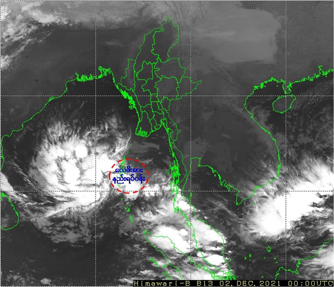 ဘင်္ဂလားပင်လယ်အော်အခြေအနေ။ ယနေ့မြန်မာစံတော်ချိန် (၀၆:၃၀)နာရီအချိန် တိုင်းထွာချက်များအရ ကပ္ပလီပင်လယ်ပြင်အလယ်ပိုင်းတွင်ဖြစ်ပေါ်နေသော လေဖိအားနည်းရပ်ဝန်း(Low Pressure Area)သည် ဘင်္ဂလားပင်လယ်အော်အရှေ့တောင်ပိုင်းနှင့် ယင်းနှင့်ဆက်စပ်လျက်ရှိသော ကပ္ပလီပင်လယ်ပြင်သို့ ရောက်ရှိခဲ့ပြီး ဆက်လက်တည်ရှိနေပါသည်။ အဆိုပါ လေဖိအားနည်းရပ်ဝန်းသည် အနောက်-အနောက်မြောက်ဘက်သို့ ဆက်လက်ရွေ့လျားပြီး၊ ပိုမိုအားကောင်းလာနိုင်ကာနောက်(၁၂)နာရီအတွင်း ဘင်္ဂလားပင်လယ်အော်အရှေ့တောင်ပိုင်းနှင့် ယင်းနှင့်ဆက်စပ်လျက်ရှိသော ဘင်္ဂလားပင်လယ်အော်အရှေ့အလယ်ပိုင်း၌ မုန်တိုင်းငယ်(Depression)အဖြစ်သို့လည်းကောင်း၊ (၃.၁၂.၂၀၂၁)ရက်နေ့တွင် ဘင်္ဂလားပင်လယ်အော်အလယ်ပိုင်း၌ ဆိုင်ကလုန်းမုန်တိုင်း(CyclonicStorm)အဖြစ်သို့လည်းကောင်း ရောက်ရှိနိုင်သည်ဟု ခန့်မှန်းရပါသည်။ဘင်္ဂလားပင်လယ်အော်မြောက်ပိုင်းတွင် တိမ်အနည်းငယ် ဖြစ်ထွန်းနေပြီး၊ ကပ္ပလီပင်လယ်ပြင်နှင့် ကျန်ဘင်္ဂလားပင်လယ်အော်တို့တွင် တိမ်အသင့်အတင့်မှ တိမ်ထူထပ်နေပါသည်။