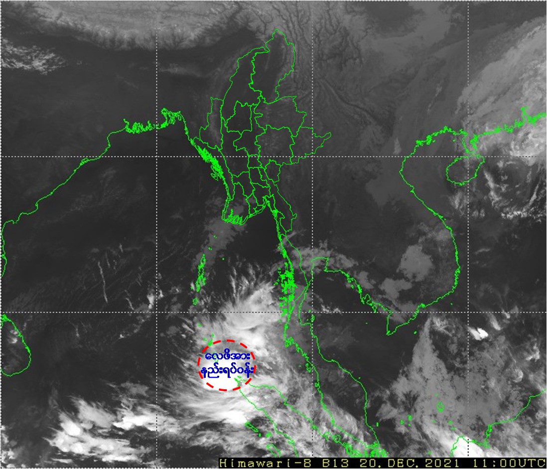 ဘင်္ဂလားပင်လယ်အော်အခြေအနေ။ ယနေ့မြန်မာစံတော်ချိန် (၀၅:၃၀)နာရီအချိန် တိုင်းထွာချက်များအရ ဘင်္ဂလားပင်လယ်အော်အရှေ့တောင်ပိုင်းနှင့် ယင်းနှင့်ဆက်စပ်လျက်ရှိသော အီကွေတာအနီး အိန္ဒိယသမုဒ္ဒရာတို့တွင် ဖြစ်ပေါ်နေသော လေဖိအားနည်းရပ်ဝန်းသည် ဆက်လက်တည်ရှိနေပါသည်။ ကပ္ပလီပင်လယ်ပြင်နှင့် ဘင်္ဂလားပင်လယ်အော်အရှေ့တောင်ပိုင်းတို့တွင် တိမ်အသင့်အတင့်မှ တိမ်ထူထပ်နေပြီး၊ ကျန်ဘင်္ဂလားပင်လယ်အော်တွင် တိမ်အနည်းငယ် ဖြစ်ထွန်းနေပါသည်။