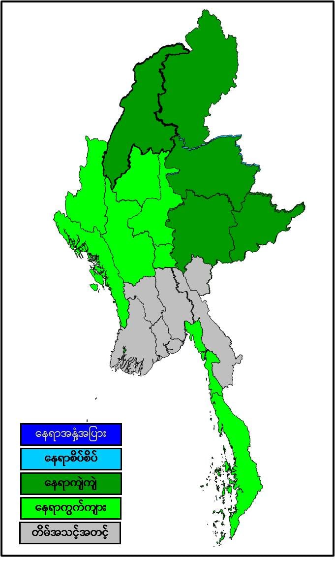 နောက်(၂)ရက်အတွက်ခန့်မှန်းချက်။ စစ်ကိုင်းတိုင်းဒေသကြီးအထက်ပိုင်းနှင့် ကချင်ပြည်နယ်တို့တွင် နေရာစိပ်စိပ်နှင့်ရှမ်းပြည်နယ်နှင့် ကယားပြည်နယ်တို့တွင် နေရာကျဲကျဲ မိုးထစ်ချုန်းရွာနိုင်ပါသည်။