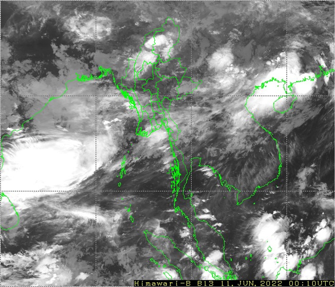 ယနေ့ညနေအထိ ခန့်မှန်းချက်။ စစ်ကိုင်းတိုင်းဒေသကြီး အောက်ပိုင်း၊ မန္တလေးတိုင်းဒေသကြီးနှင့် မကွေးတိုင်းဒေသကြီးတို့တွင် နေရာကျဲကျဲ၊ ချင်းပြည်နယ်နှင့် ကယားပြည်နယ်တို့တွင် နေရာစိပ်စိပ်နှင့် ကျန်တိုင်းဒေသကြီးနှင့် ပြည်နယ်တို့တွင် နေရာအနှံ့အပြားမိုးထစ်ချုန်းရွာပြီး၊ စစ်ကိုင်းတိုင်းဒေသကြီး အထက်ပိုင်း၊ ကချင်ပြည်နယ်၊ ရခိုင်ပြည်နယ်နှင့် မွန်ပြည်နယ်တို့တွင် နေရာကွက်၍ မိုးကြီးနိုင်ပါသည်။ ရွာရန်ရာနှုန်းပြည့်ဖြစ်ပါသည်။